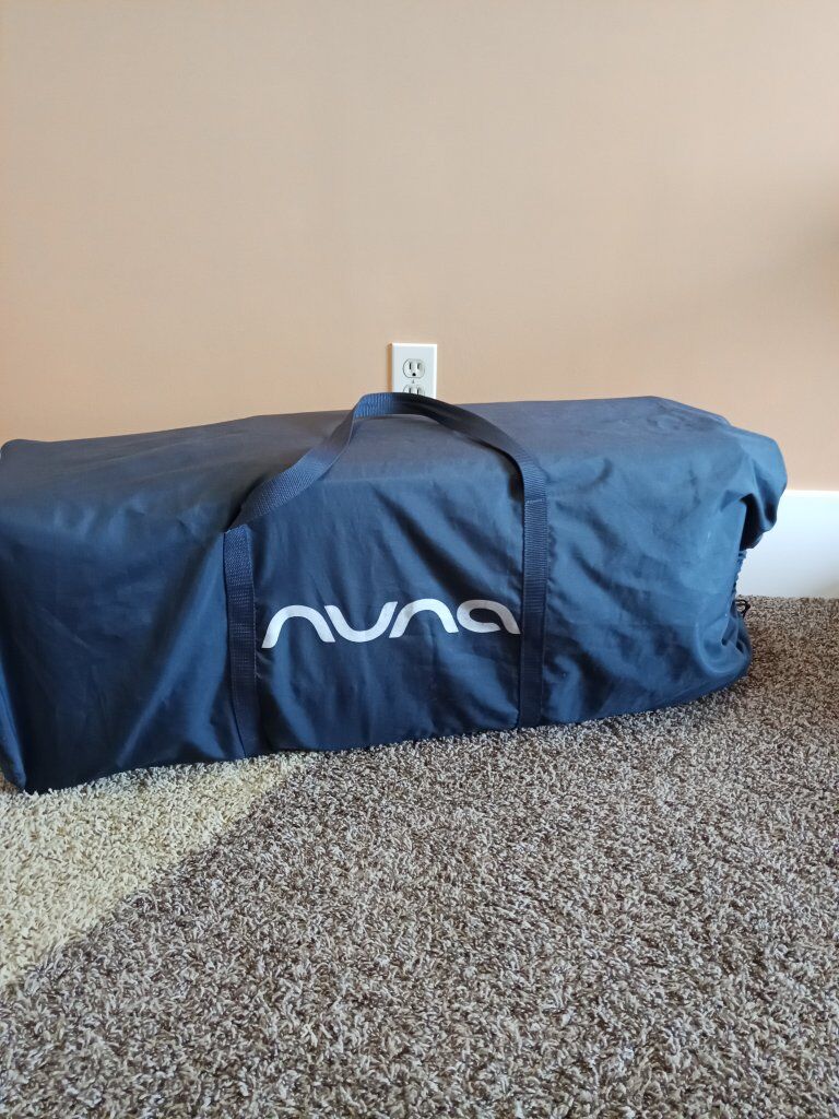 Nuna brand “Cove Aire Go” travel crib doubles as a playard and bassinet for baby’s growing needs.