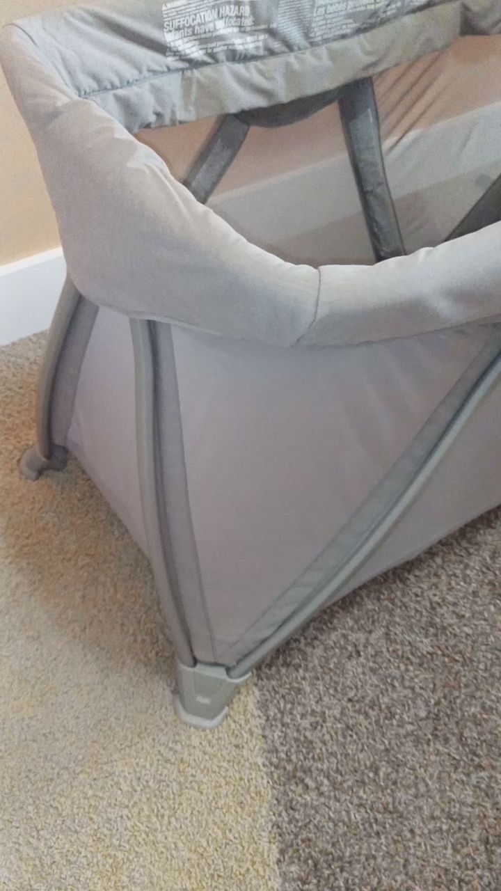 This very sturdy pack and play is easy to set up and take down in one movement, even with the bassinet attached. All joints are covered to avoid pinching.