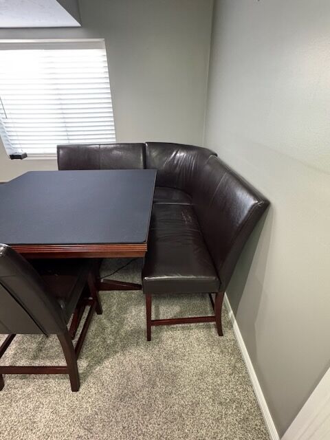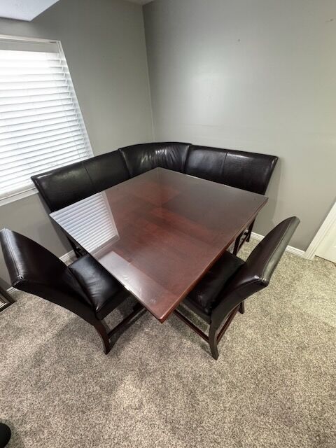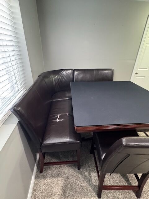 Moving and needing to downsize. This corner game table has been loved, we are sad to see it go. Glass table topper and black game mat (both pictured) have left the table in perfect condition. The leather on the seats are worn.