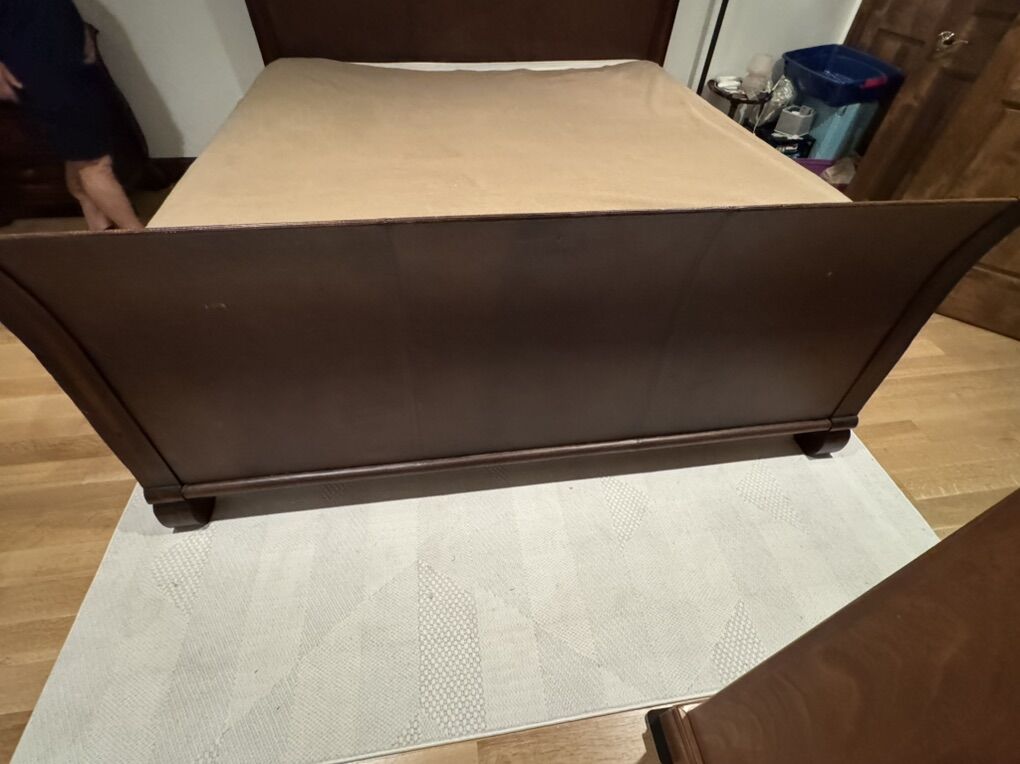 VenmoLeather Covered, Solid Wood King Size Sleigh Bed Frame. Headboard and footboard are covered in leather. Sideboards are solid wood.