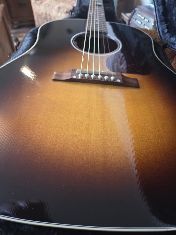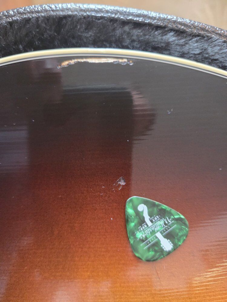 VenmoAs classic as it gets. in very good player condition. it's got strum marks below the pick guard you can see in glare, and one significant scratch, as pictured, and one ding, also pictured. (photographed next to the pick for reference) structurally perfect, and plays and sounds just outstanding! sounds great plugged in. OHSC thanks