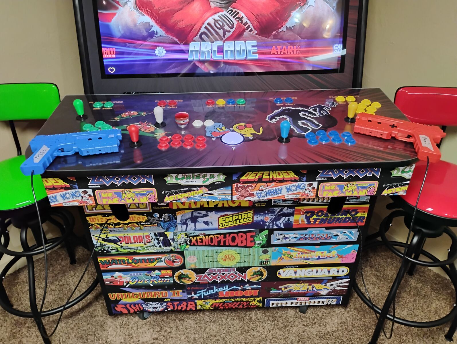 Arcade cabinet from GameRoomSolutions. This unit is about 6 feet tall on its crazy wheels, and uses a 43” screen. There are nearly 2000 games installed on a Windows 11 PC. Joysticks were upgraded to bat-style Sanwa JLF’s, also includes a spinner for games like Tempest, a 4-way joystick to more easily play classic arcade games like Donkey Kong, and a lighted trackball for games like Millipede. There are also 2 Sinden guns that will play a variety of classic arcade shooters like Wild Gunman and Operation Wolf. The section with the controls comes off easily and will allow this cabinet to fit through doorways without disassembling it completely. About $4000 invested in this. Asking $2500, cash only, local pickup from Idaho Falls.