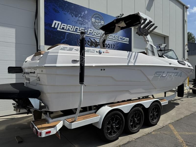 Supra SE with Supercharged Raptor 575 engine with 101 engine hours. This boat comes with clamping board racks, power tower, surf system, thrusters, surf pipe, triple axle Boatmate trailer with bow ladder.