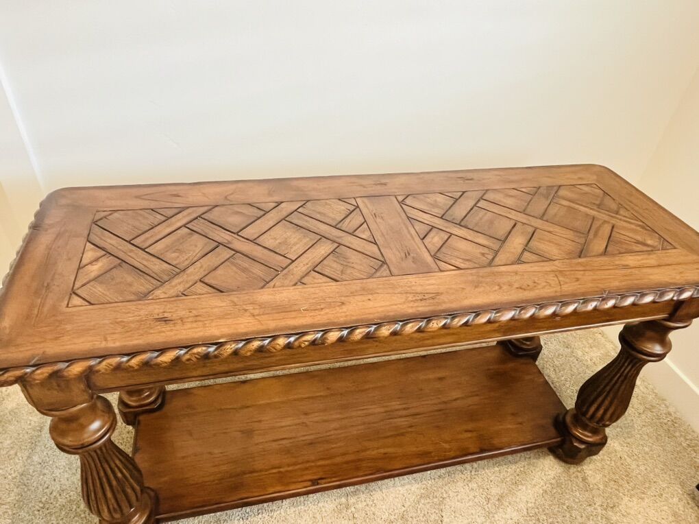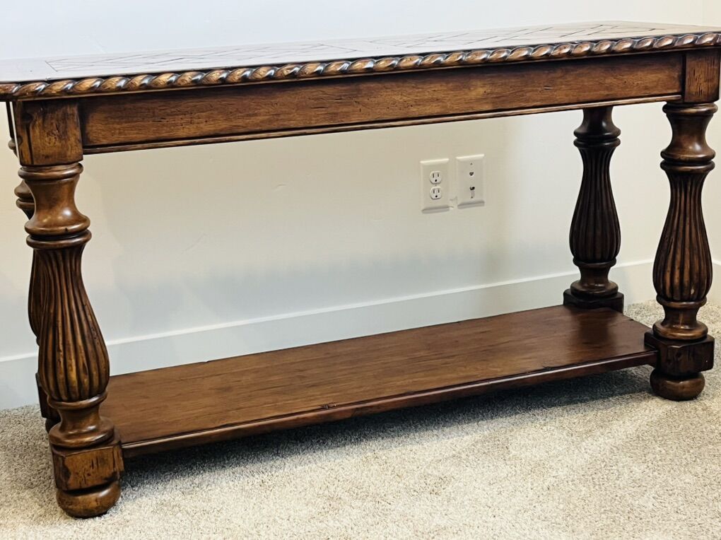 Heavy and well cared for entry table with roping design on the edges and beautiful checkered top. Asking $125.00. Measures approx 54” wide, 19 1/2” deep 31” tall.