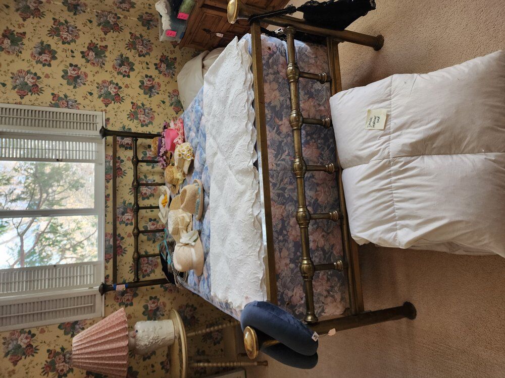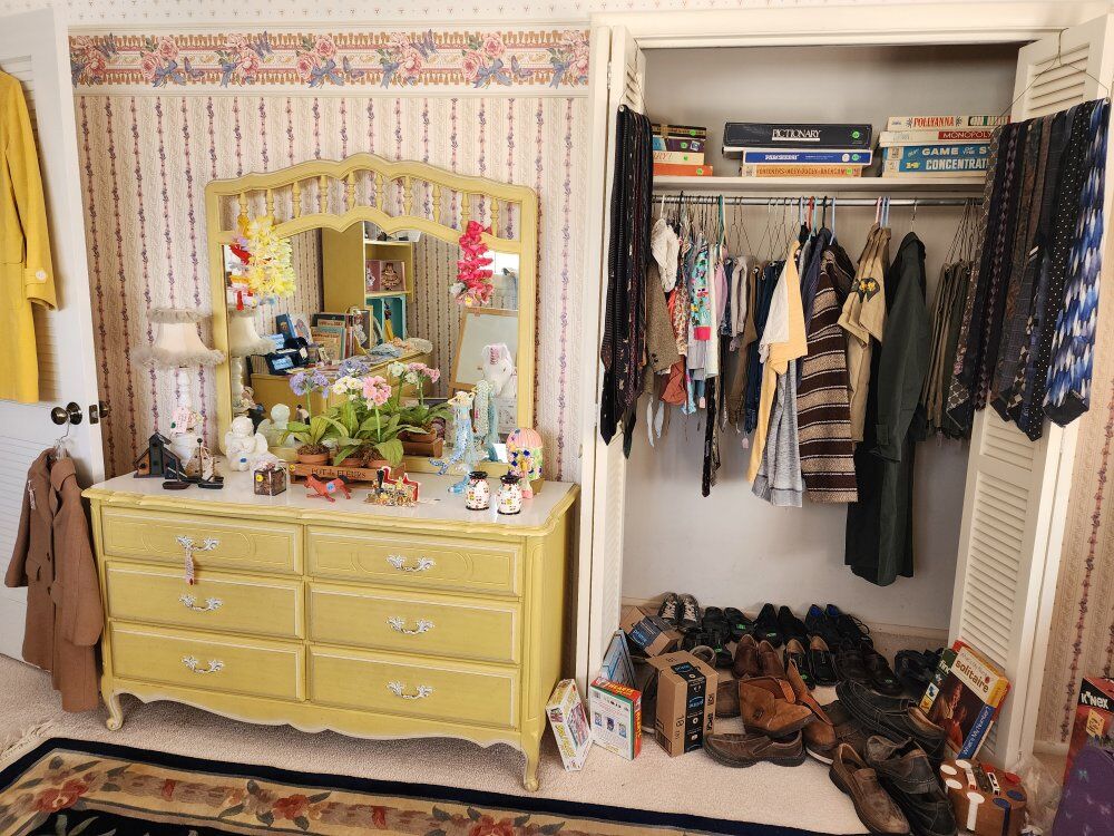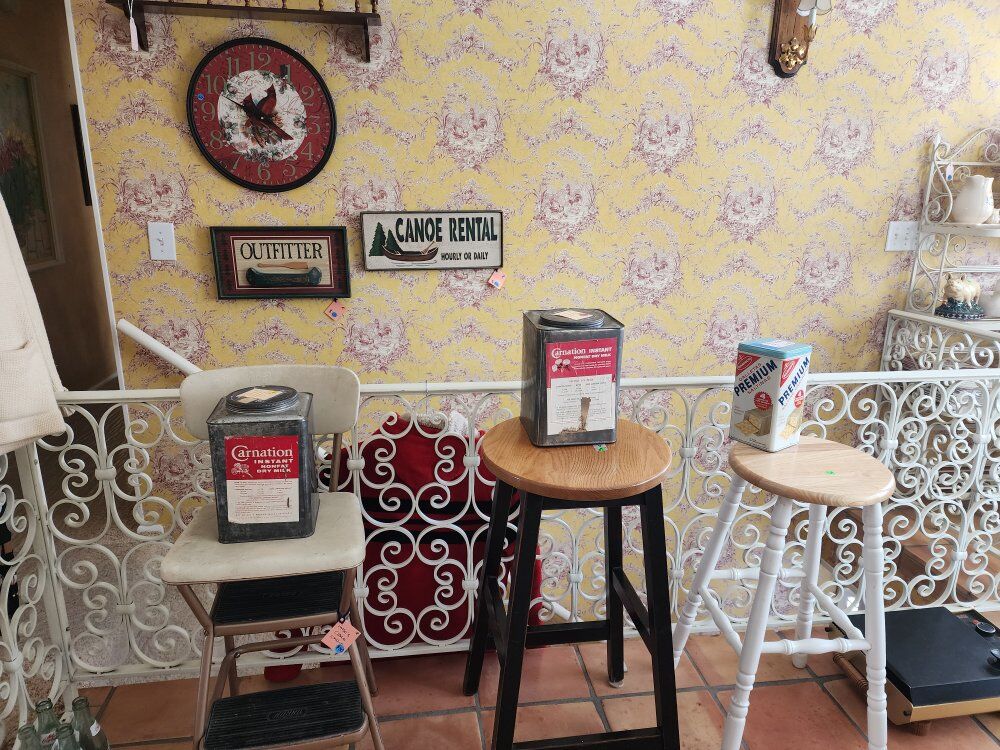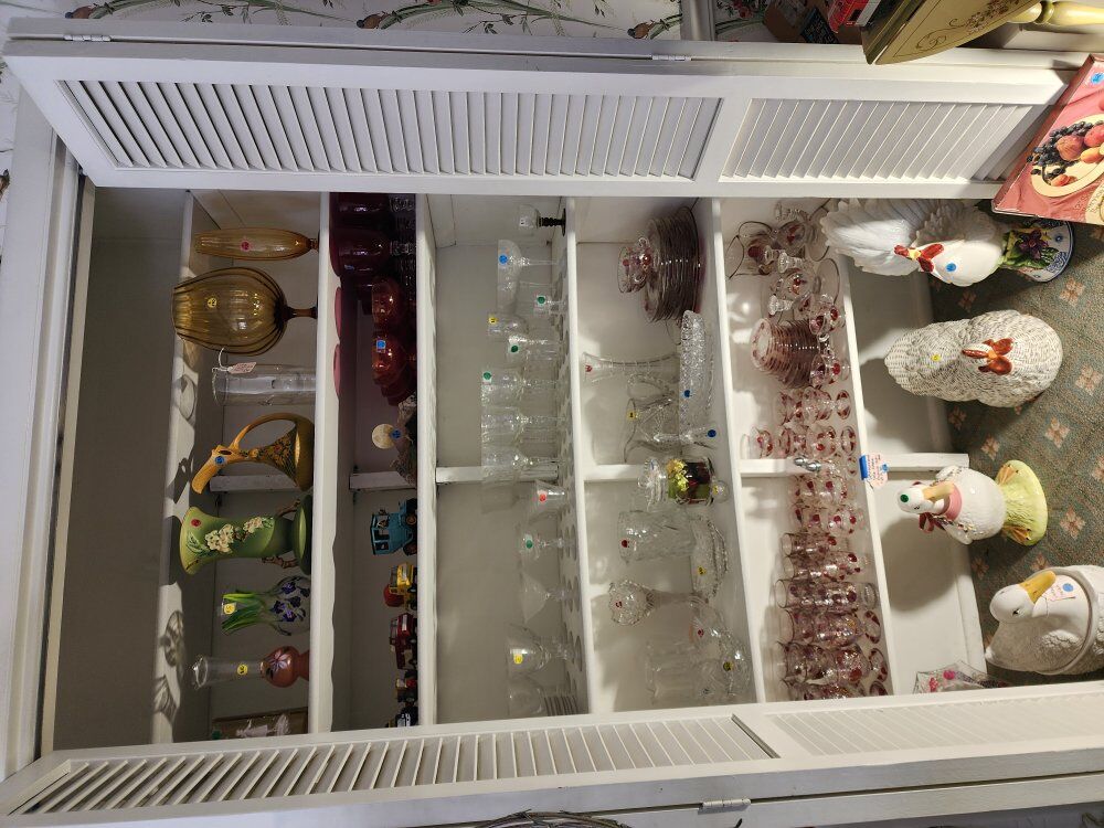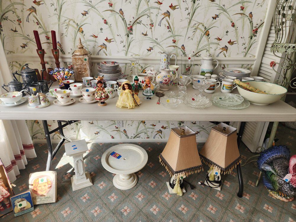 We have vintage clothes and hats dating back to the 50's and 60's 70' military uniforms A fantastic Victorian solid brass bed Framed artwork Drexel bedroom furniture- mid-century Mid-century childs bedroom set An antique pump organ- only $25 A vintage game/poker table Toys Vintage vinyl albums Crystal of all kinds Kitchen items Kitchen table set Outdoor furniture Fenton glass Dresden porcelain Decor for all the holidays and so much more!!! If you've ever wanted it, we have 10!