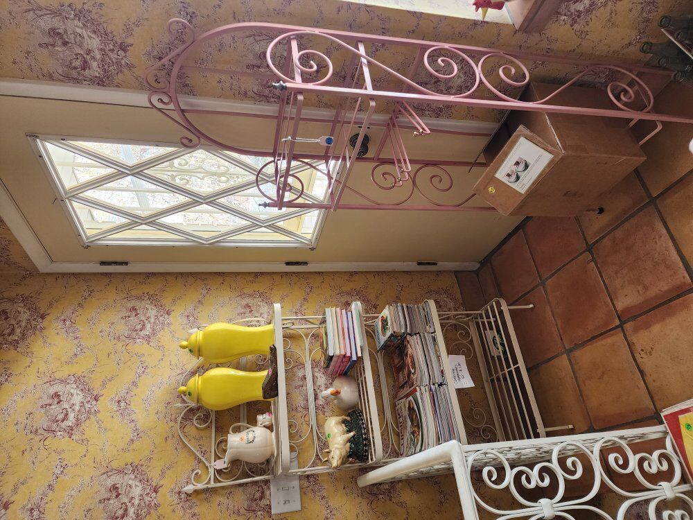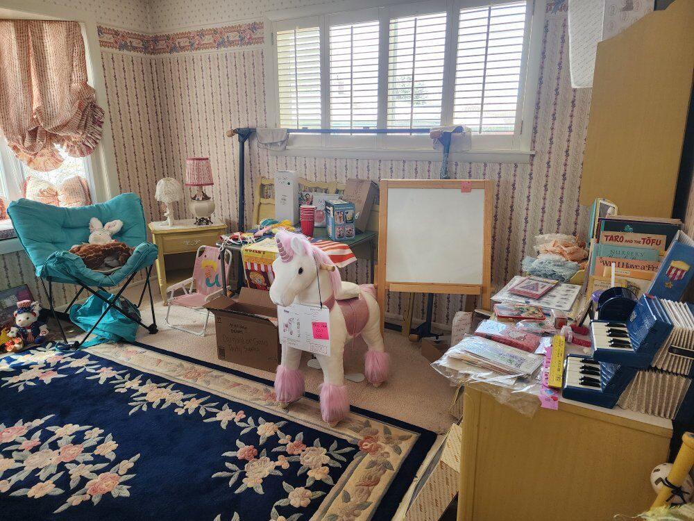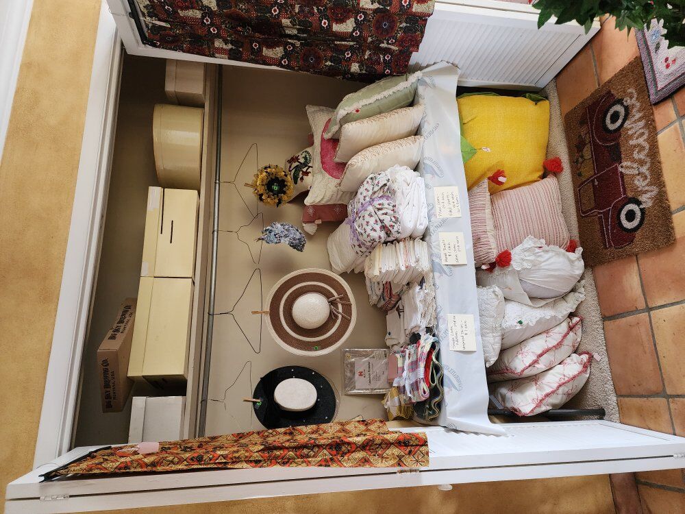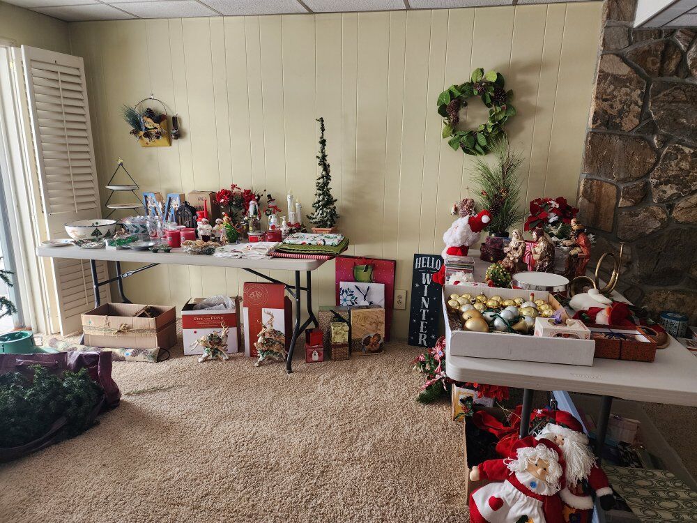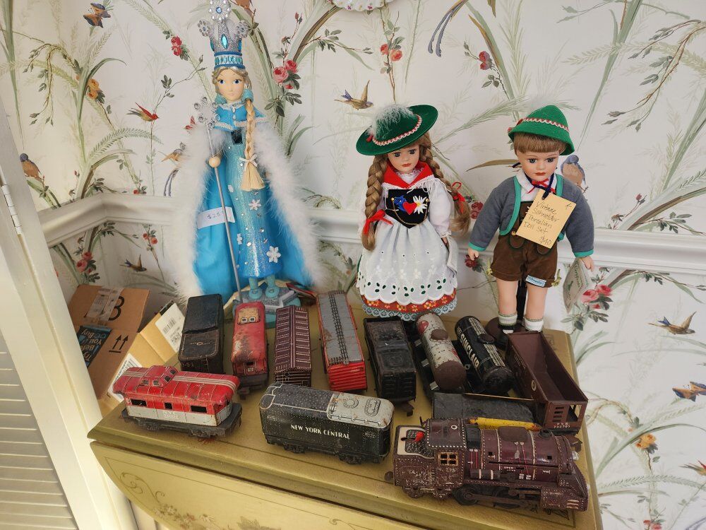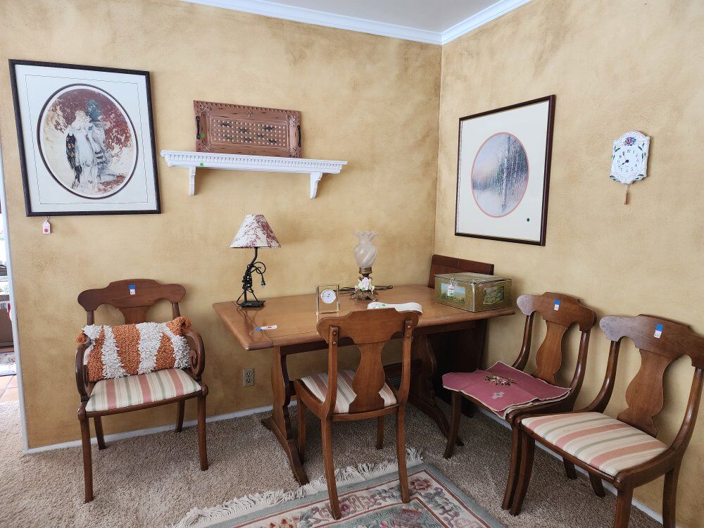 We have vintage clothes and hats dating back to the 50's and 60's 70' military uniforms A fantastic Victorian solid brass bed Framed artwork Drexel bedroom furniture- mid-century Mid-century childs bedroom set An antique pump organ- only $25 A vintage game/poker table Toys Vintage vinyl albums Crystal of all kinds Kitchen items Kitchen table set Outdoor furniture Fenton glass Dresden porcelain Decor for all the holidays and so much more!!! If you've ever wanted it, we have 10!