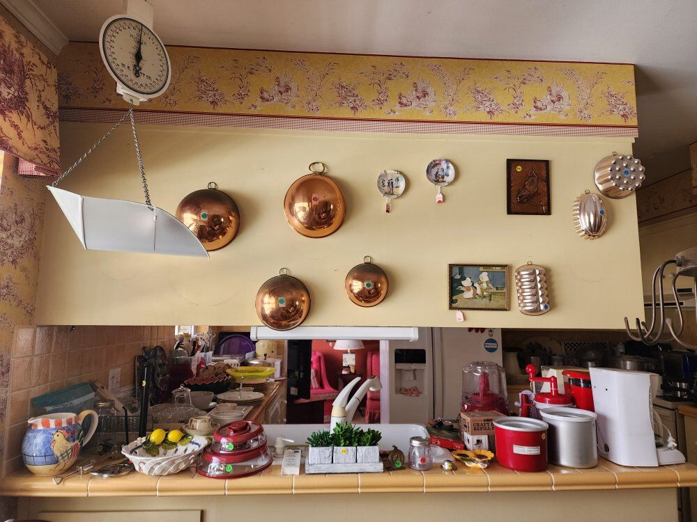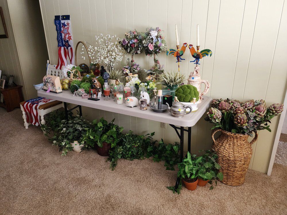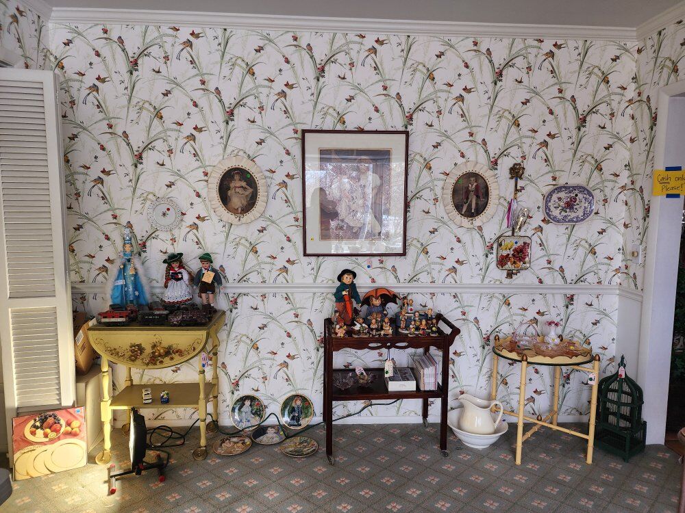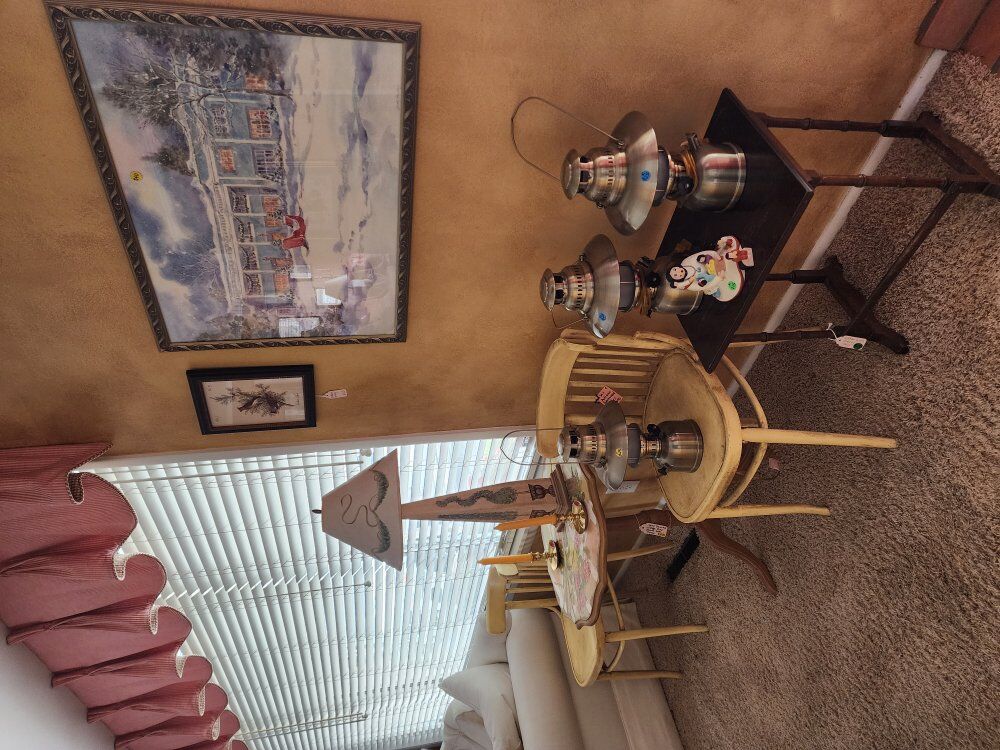 We have vintage clothes and hats dating back to the 50's and 60's 70' military uniforms A fantastic Victorian solid brass bed Framed artwork Drexel bedroom furniture- mid-century Mid-century childs bedroom set An antique pump organ- only $25 A vintage game/poker table Toys Vintage vinyl albums Crystal of all kinds Kitchen items Kitchen table set Outdoor furniture Fenton glass Dresden porcelain Decor for all the holidays and so much more!!! If you've ever wanted it, we have 10!