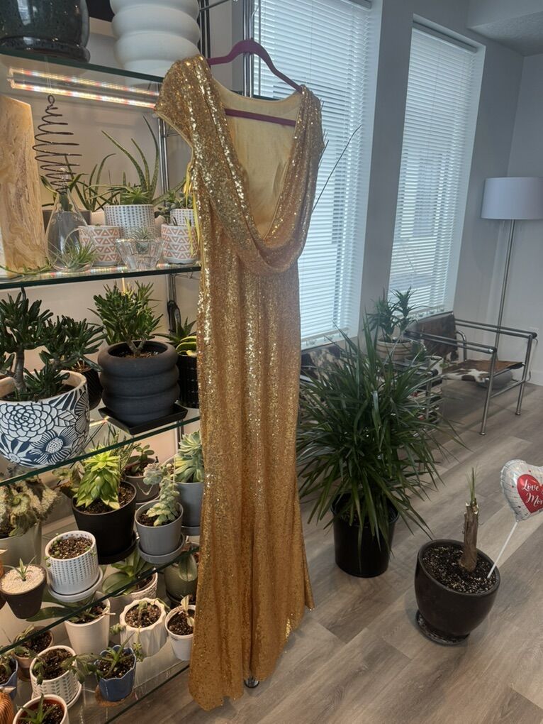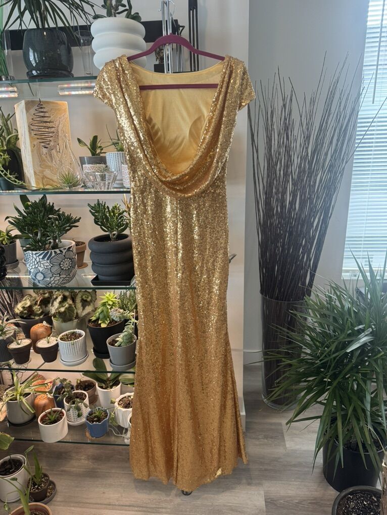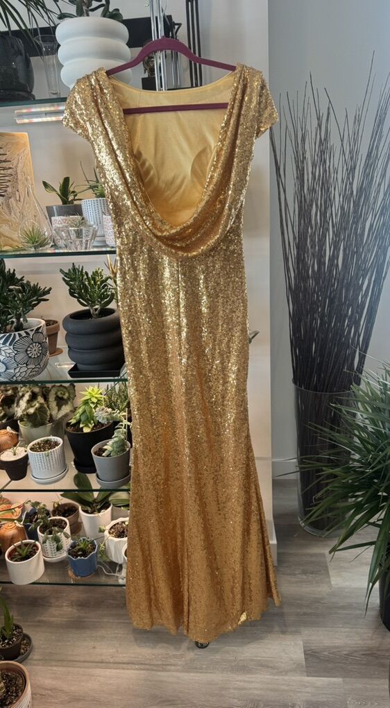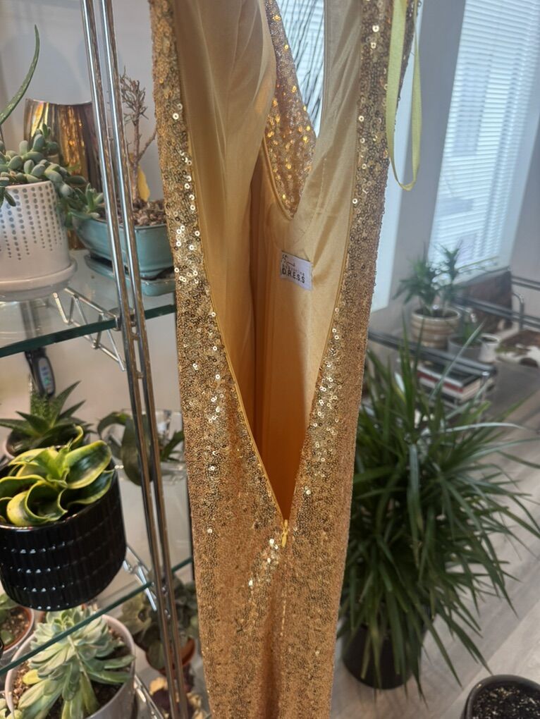 VenmoStunning. Full length gold sequin ball gown. Perfect for prom! Fully lined with a low back and side zipper. Immaculate inside and out. Never worn. Front length- 56 1/2’ Back length 58’ Shoulder to shoulder 16’ Waist 14’