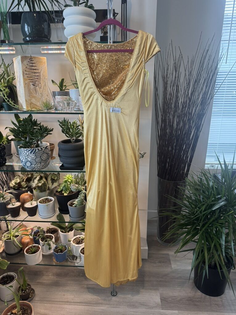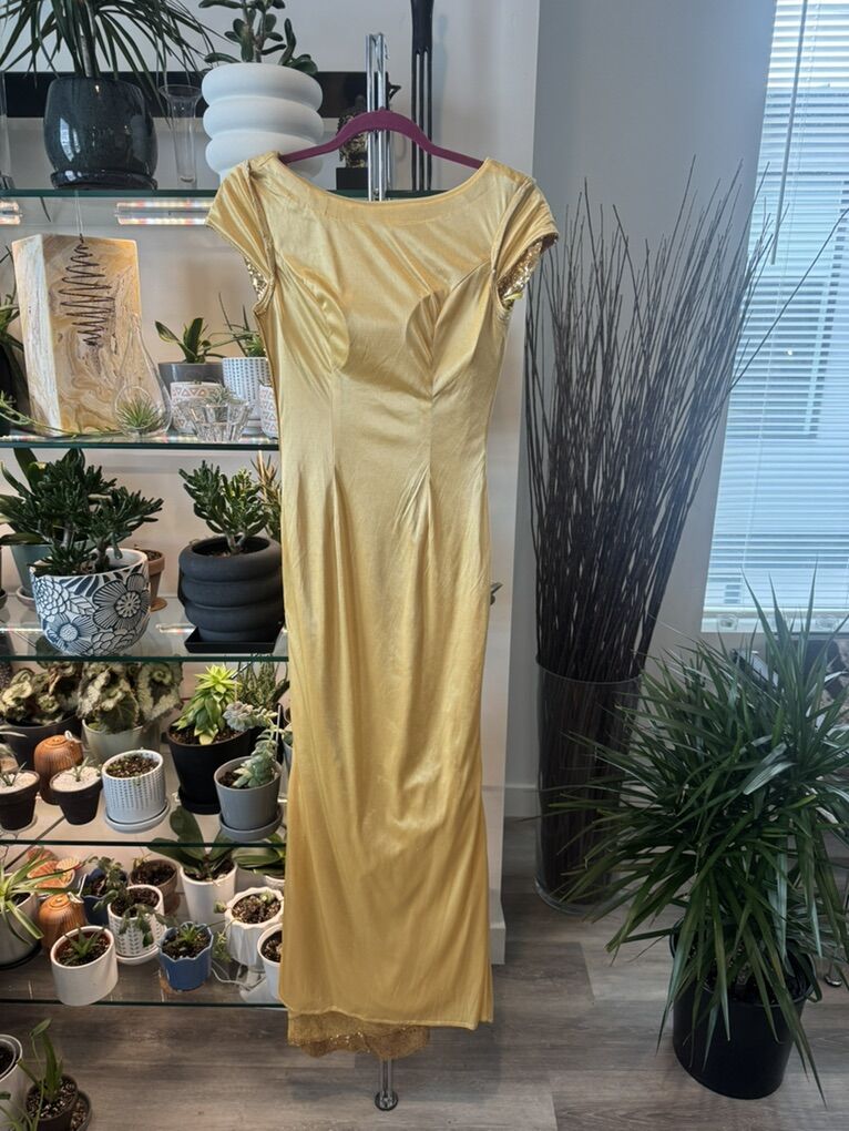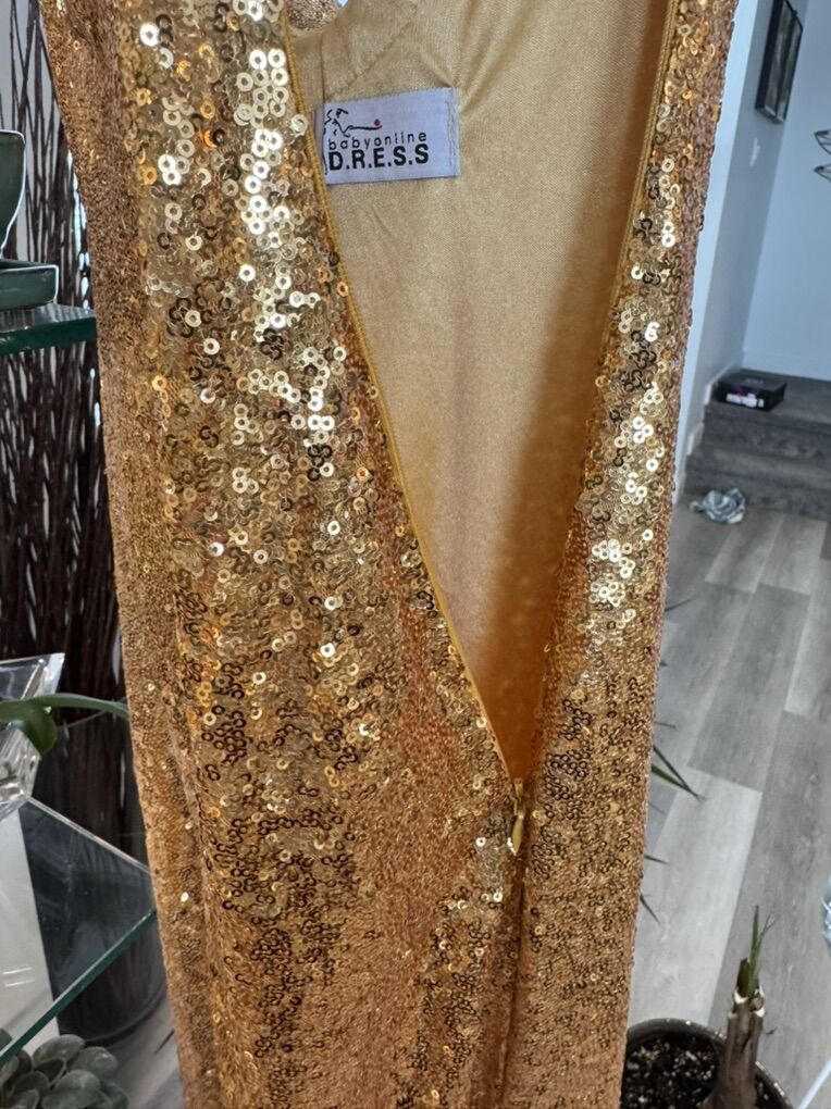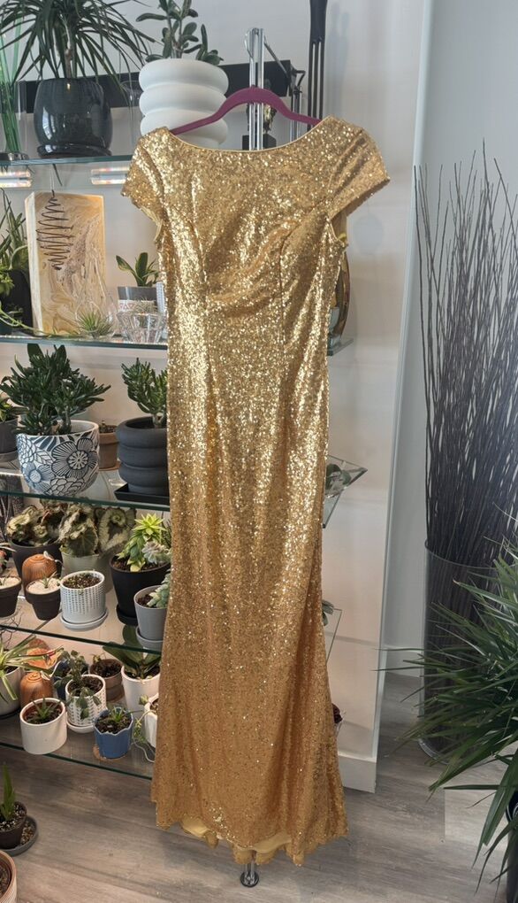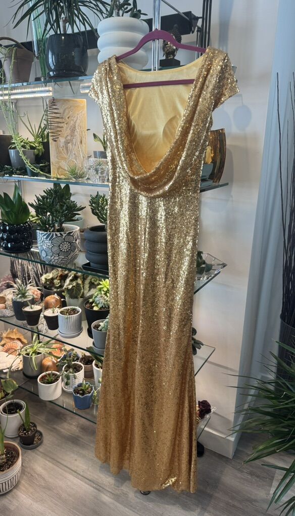 VenmoStunning. Full length gold sequin ball gown. Perfect for prom! Fully lined with a low back and side zipper. Immaculate inside and out. Never worn. Front length- 56 1/2’ Back length 58’ Shoulder to shoulder 16’ Waist 14’
