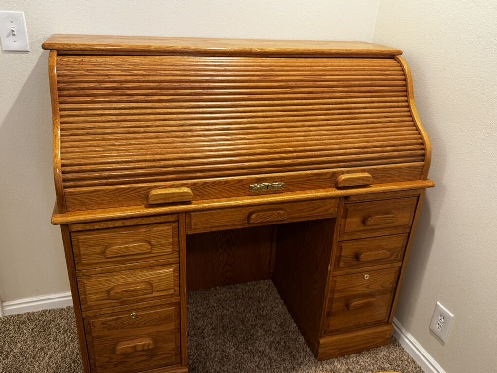 ApplePayClassic 19th Century styling with 17 drawers to organize you and your office. Two deep file drawers with heavy duty metal extension glides Locking file drawers Solid oak tambour with full canvas underneath, Roll Down tambour with locks Two pull out writing tablets Seven letter slots dividers to organize your bills and documents