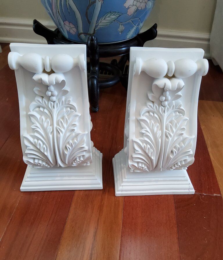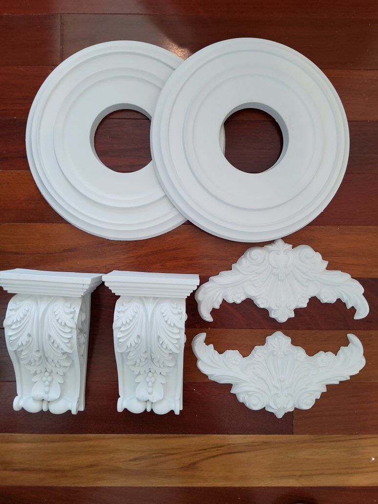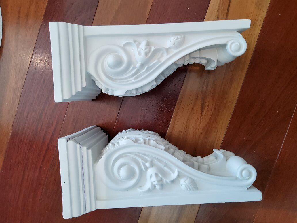Venmo12" diameter medallions with 4" middle opening. white, printable. 5 1/4" at top of corbels wide and 3 1/4 deep and 8 1/4 tall.