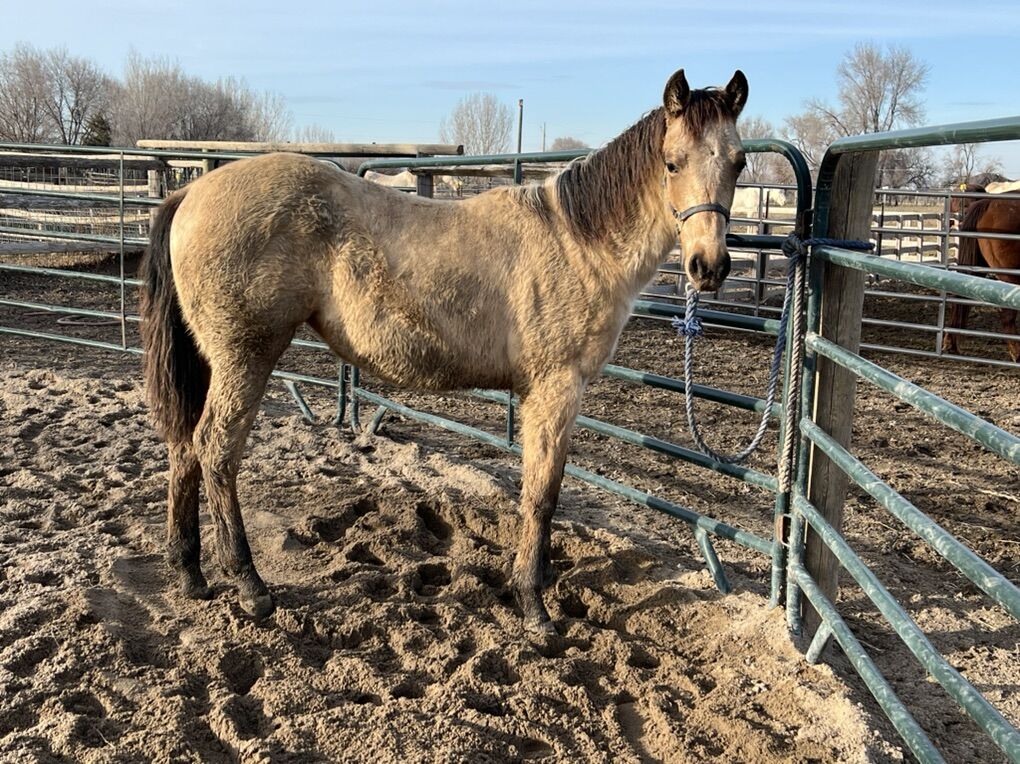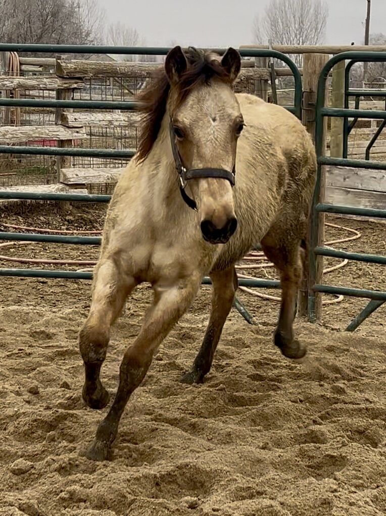 Lou is a yearling AQHA filly who is curious and fairly friendly, she halters, leads, has been tied and loads in the trailer. She is smart and sensitive but not super reactive wrapped up in a beautiful buckskin roan package. She has been dewormed multiple times, had her first vaccination and booster. Her dam is 14.2/14.3hh and sire 15.2hh we expect her to mature right around 15hh. Lou is 5 panel negative by parentage.