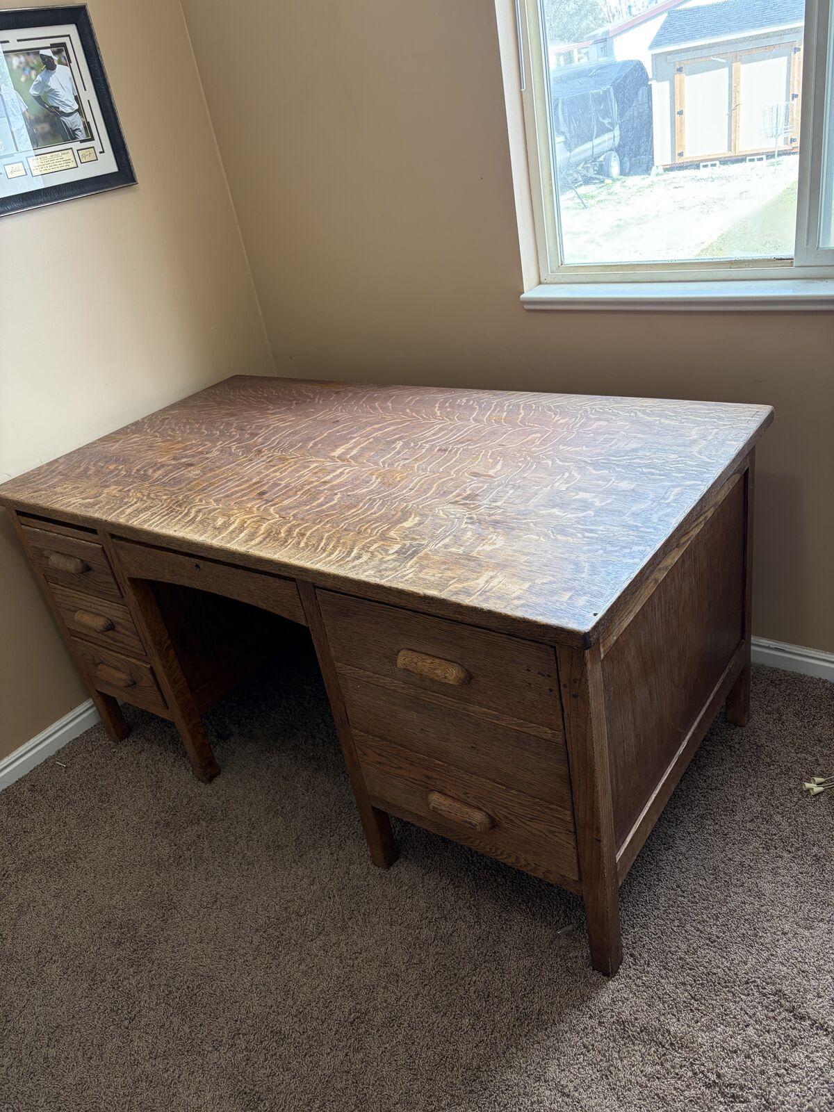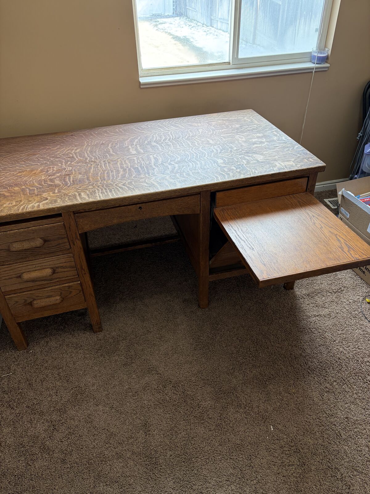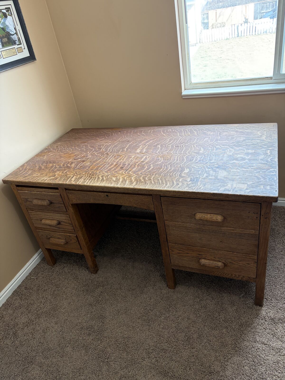 ApplePayGood antique oak desk. Dove tail drawers with a hide away printer pull out to the left. Drawers lock. I want to see it go to someone who could use it
