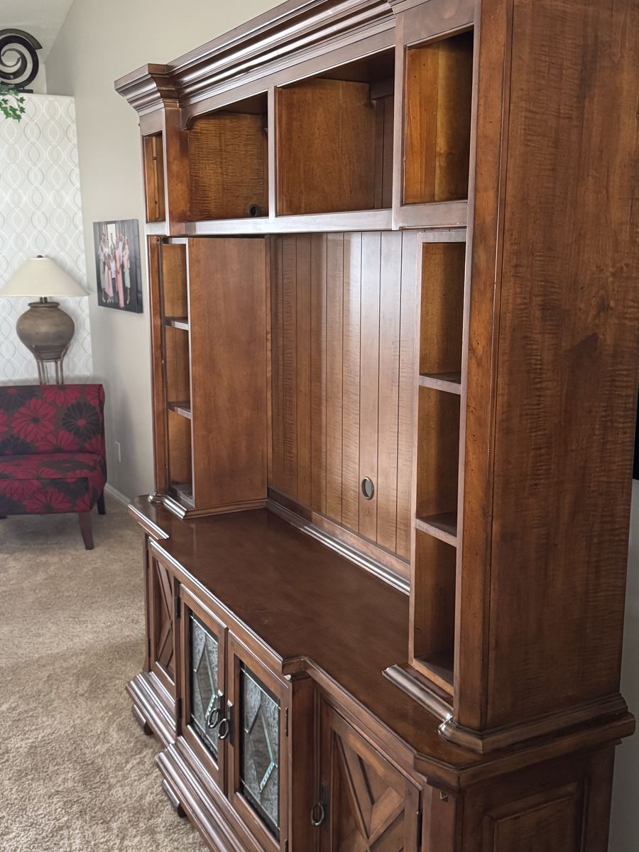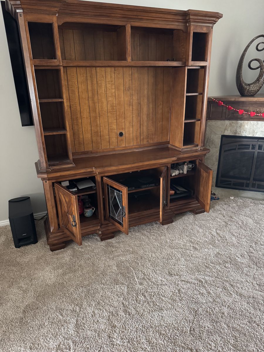 VenmoSolid Wood (very heavy), 48" x 34" tv opening, 73" x 84" overall size