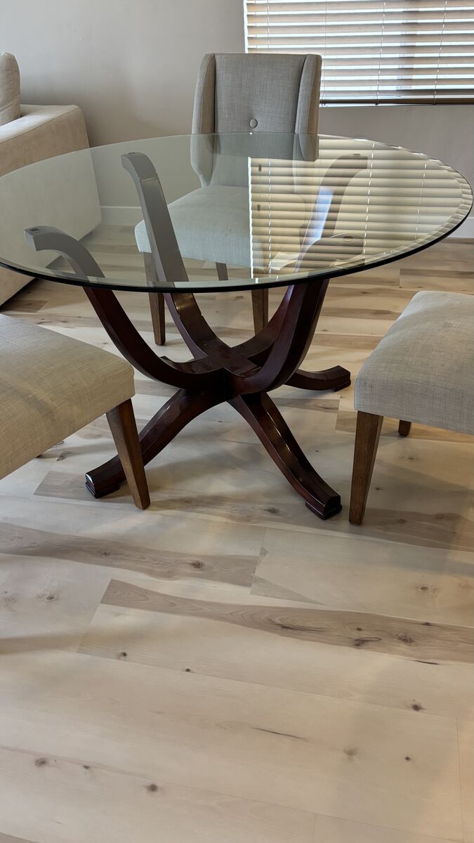 VenmoBeautiful round glass table with 3 chairs. Good condition. Chairs made out of fabric that can be clean with a wet towel or steam.