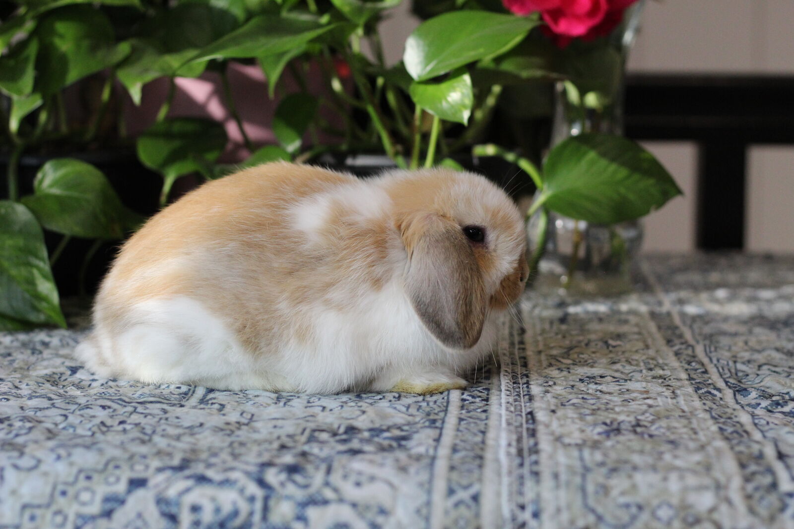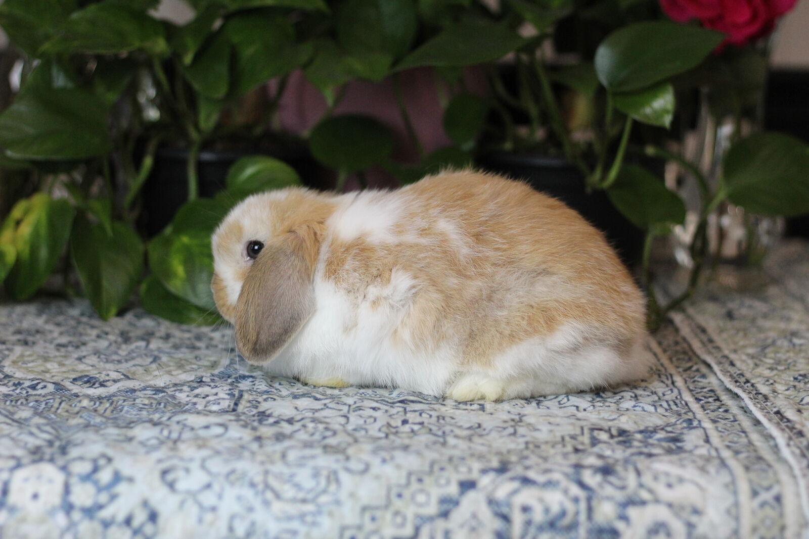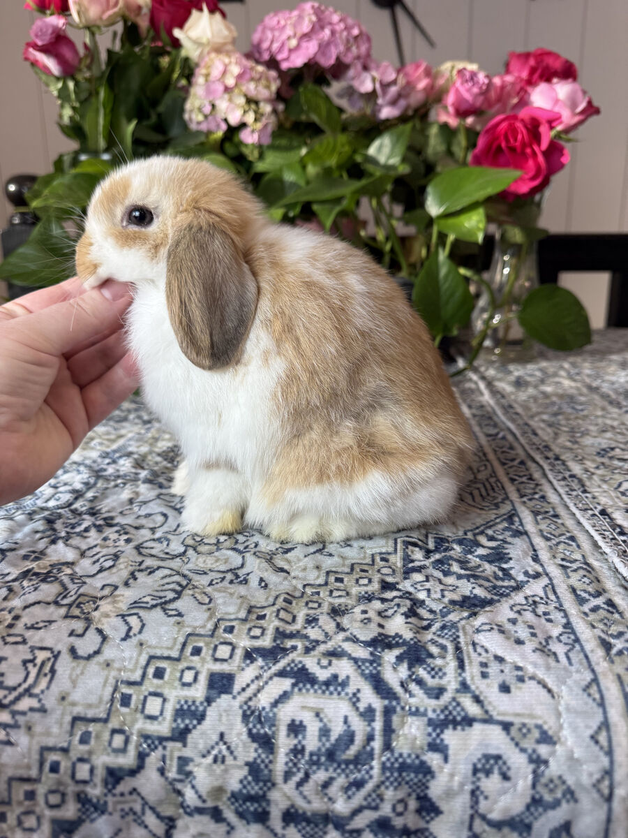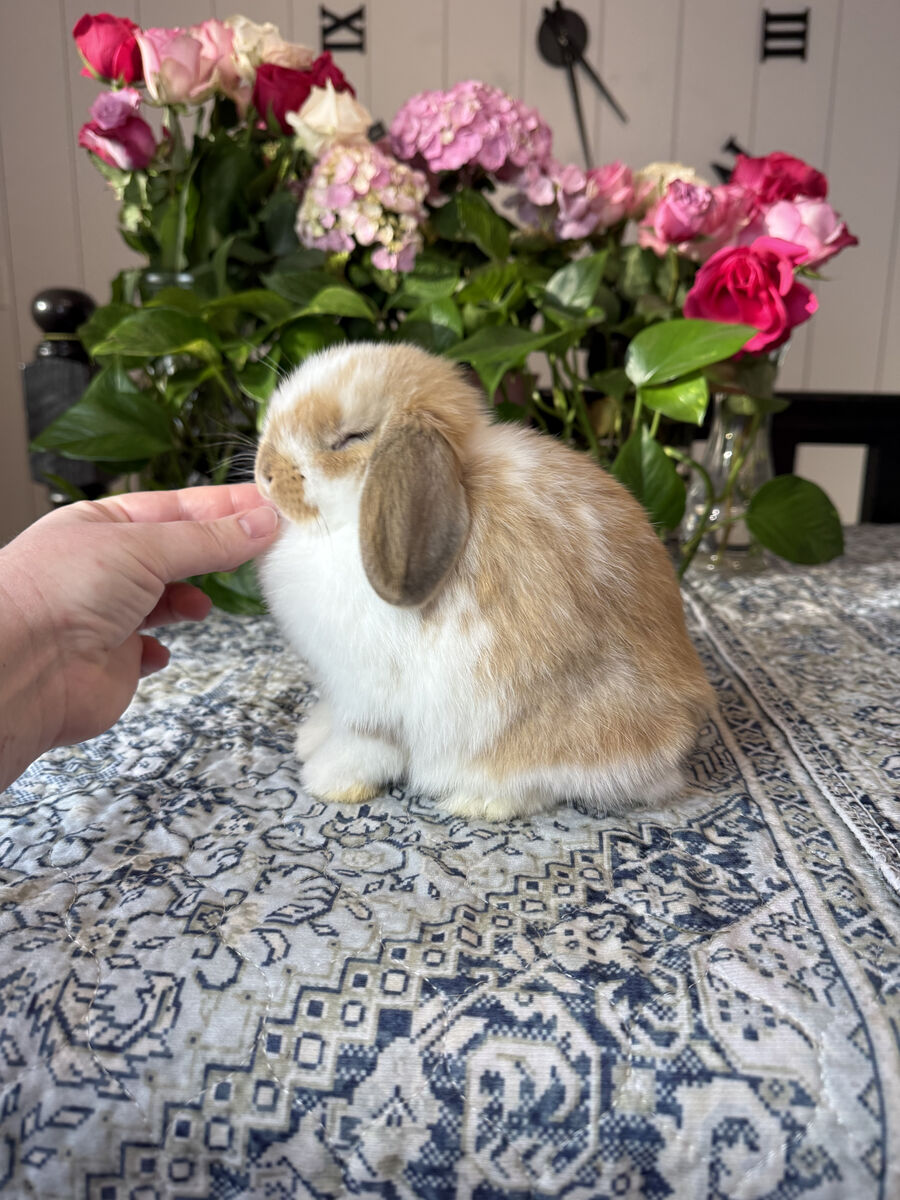 This is a bundle of spotted sass! There's lots of sweet in there, but she knows what she wants and goes for it. There's no fear in this one... or patience for posing nicely in a photo. She is very curious and excited about everything. She does not startle easily which is a huge plus in a bunny.