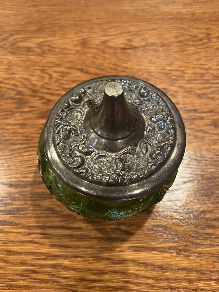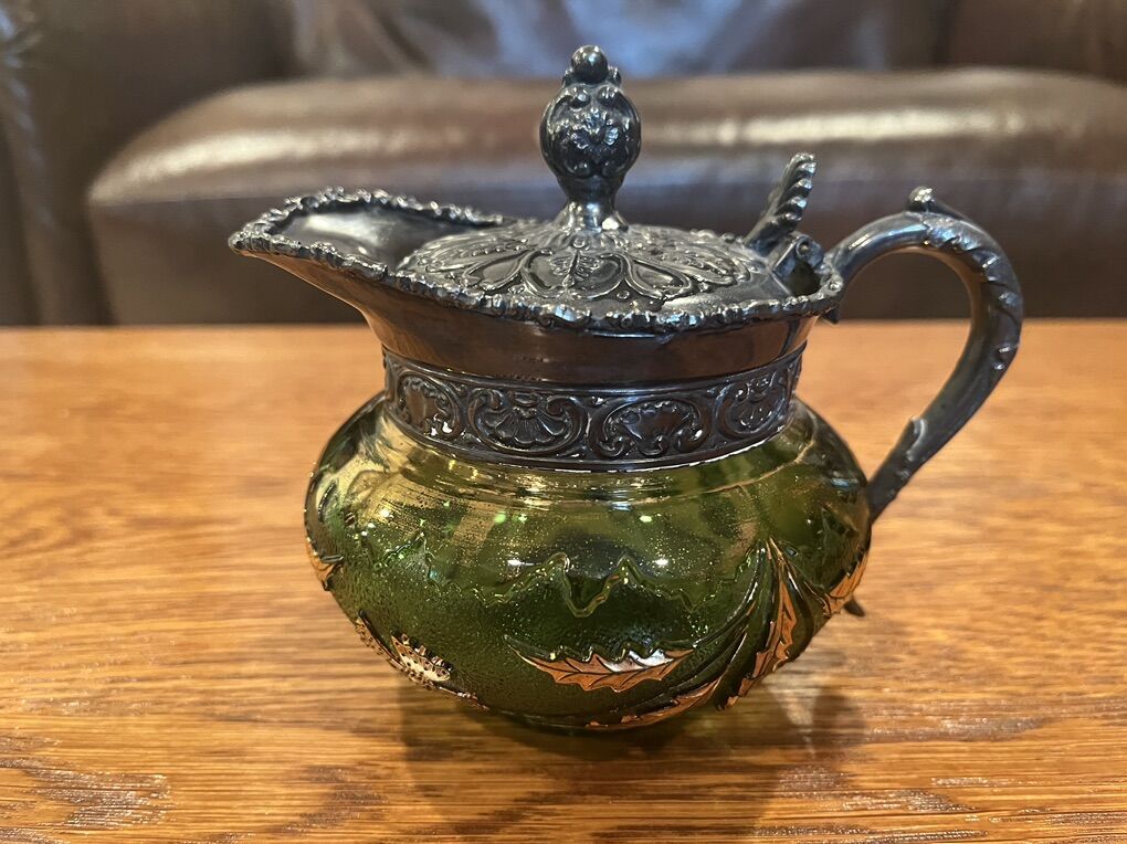 VenmoThis is a gorgeous and very decorative set. This is emerald green Delaware glass. Made by the US Glass Company. They started making glass in 1899. This has the gold gilt on it, which really adds to the floral and leaf pattern. This is a heavier thicker glass. The sugar and creamer both have very beautiful tops on them. The tops have some type on metal on them. The creamer lid is hinged. This set is very unusual and hard to find set. A must see item. Sold only as a set. Price is firm.