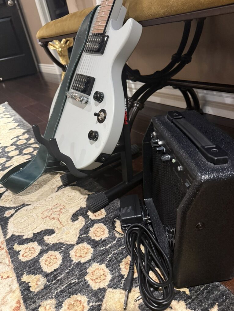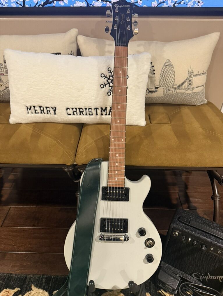 VenmoThe beginner Epiphone electric guitar is a right-handed, 6-string instrument from the Epiphone Les Paul series. Made with a solid mahogany body and a rosewood fretboard, this guitar features 22 frets and a cool gray color. The set includes a stand, amp, and strap, making it a complete package for any aspiring musician looking to rock their very first electric guitar. With the trusted Epiphone brand name behind it, this guitar is sure to deliver excellent sound quality and performance for beginners looking to master the art of electric guitar playing. Thanks AI lol. Anyway it’s a decent beginner set hope someone else can enjoy it thanks.