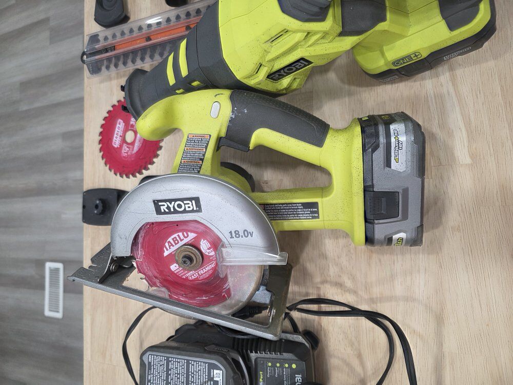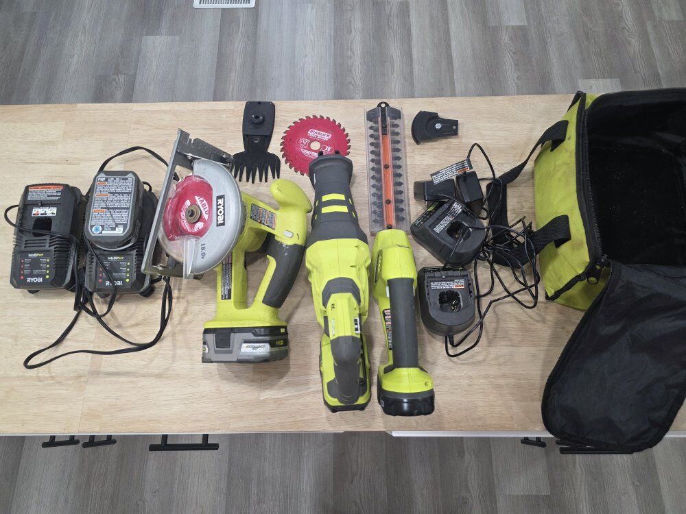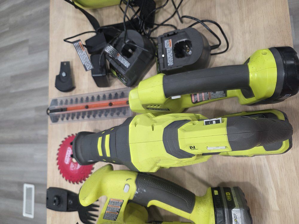 PayPalI want to sell these as a set 10" Skill Saw Reciprocating Saw Power Garden Shears 1 Ryobi 3AH 18Volt Battery 1 Ryobi 1.5AH 18Volt Battery 2 Ryobi 2AH 18Volt Battery Each battery fits the different tools. 1 Ryobi tote 4 Charging Stations