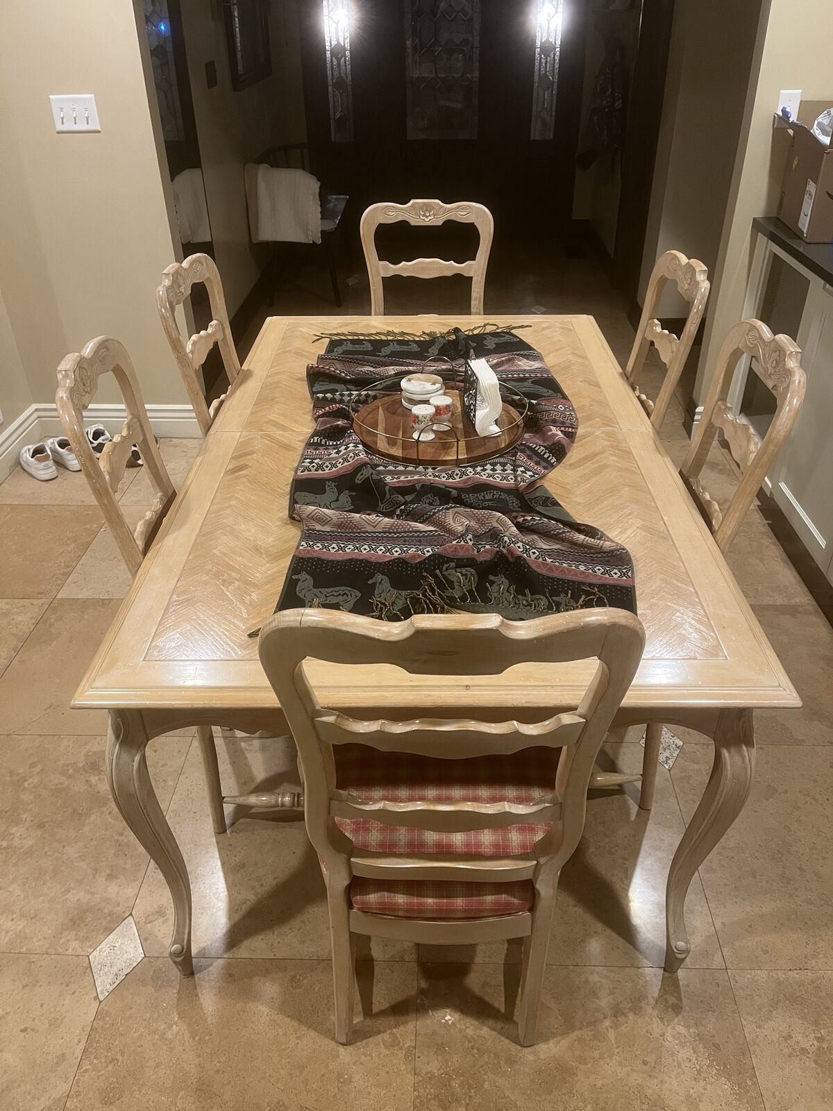 VenmoComes with 8 chairs including 2 captains chairs. We also have a broken leaf that comes with it. Can be fixed with wood glue. Dimensions: 72”x42” height: 30” Cash or Venmo only