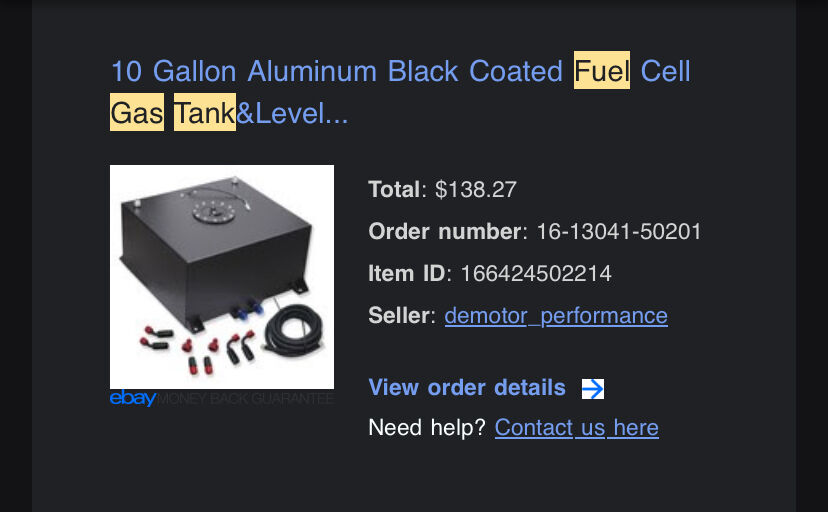 DESCRIPTION Fuel Cell --Universal style. --This is a 10-gallon/40L fuel cell. --Black aluminum. --0-90 Ohm fuel sender. --Dual - 10 outlets --Dual - 10 vent outlets (Top of the cell). --Sump measures 6" x 6" x 2" deep. --Includes sending unit. --Dimension: 16.5" (L) x 16.5" (W) x 9" (H) --Includes anti-slosh foam. Oil Fuel Line --Nylon braided CPE fuel line is best for oil gas lines, fuel hoses, clutch hoses, and turbo lines. --The hose is covered with high-quality woven nylon and stainless steel braided + CPE synthetic rubber to enhance flexibility and give a cool racing appearance. --The fitting is made of T6061 aluminum, an anodized finish for high strength and good durability. --Kits Include: 1 x 12' Nylon braided 6AN fuel line 2 x 90 Degree 6AN fuel hose fitting adapter 2 x 45 Degr.