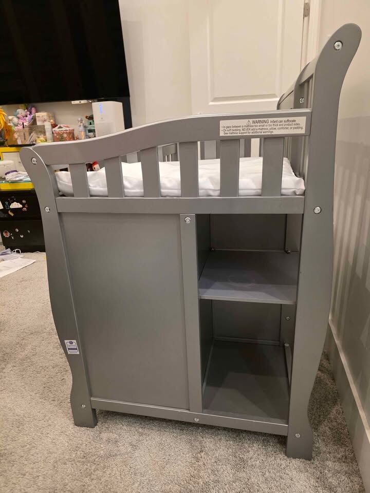 Dream On Me Jayden 4-in-1 Mini Convertible Crib + Changing Table in Storm/Steel Gre,like new condition and includes mattress. Only been used for about 5 months and my baby don't like sleeping alone...