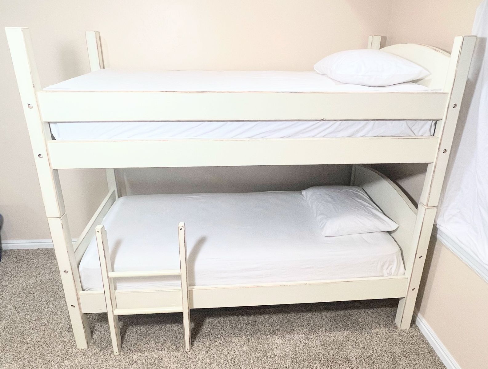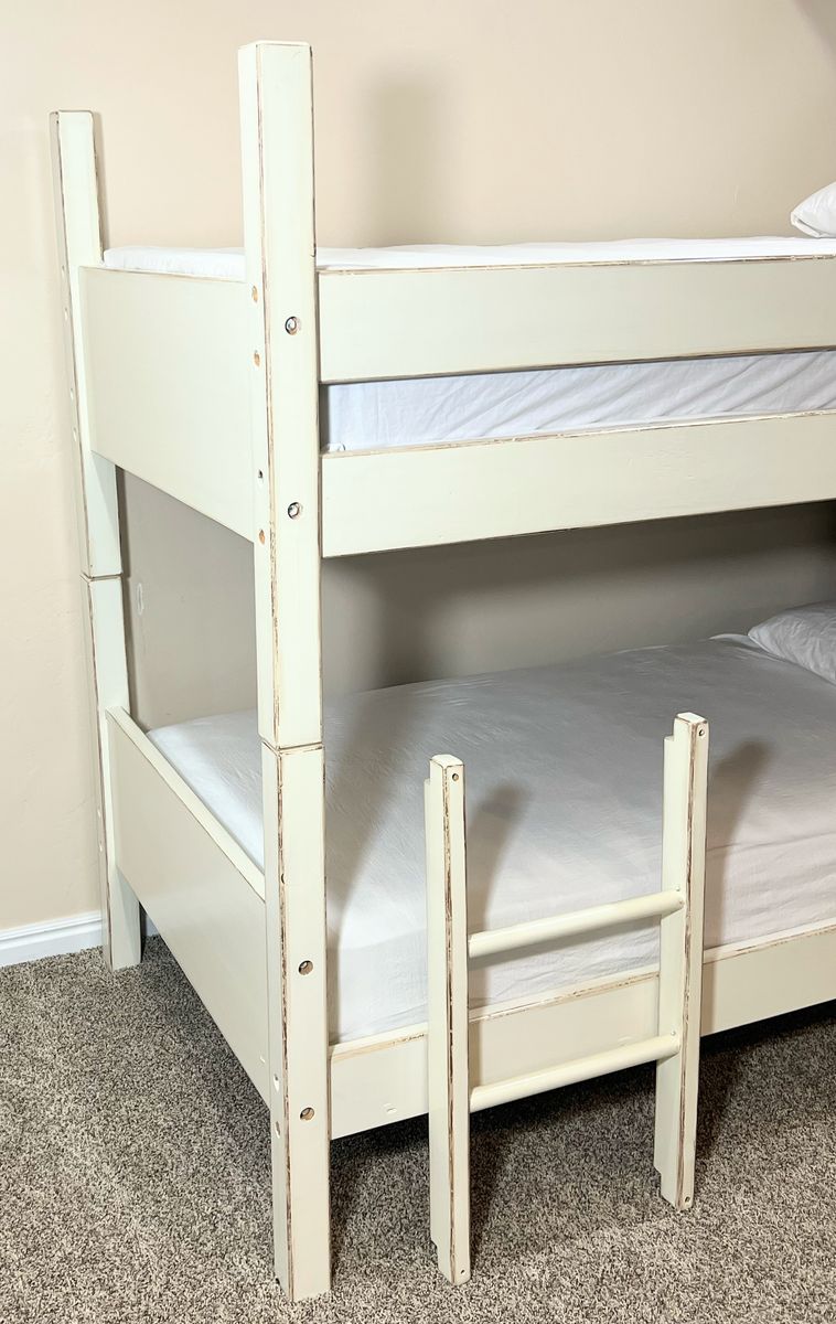 Solid wood twin-over-twin bunk beds with a custom shabby-chic hand-finished look. Intentional distressed edges are part of the design, not wear. Sealed with multiple coats of protective varnish for durability and long-lasting use.