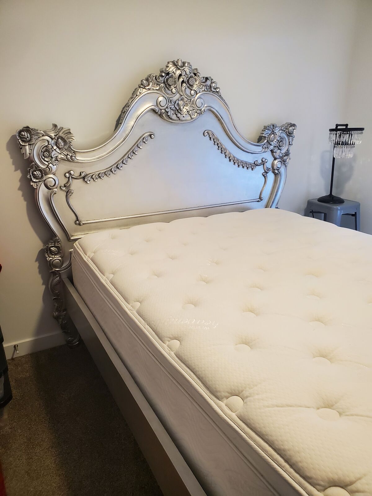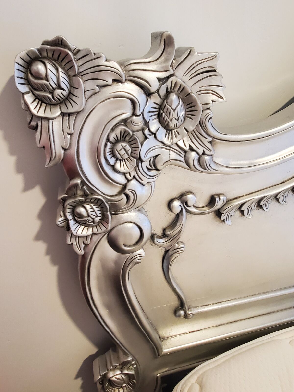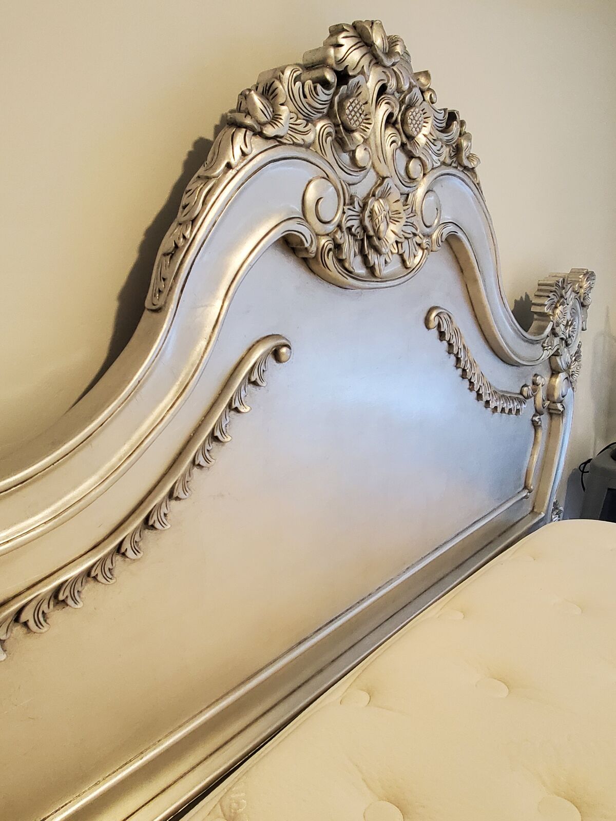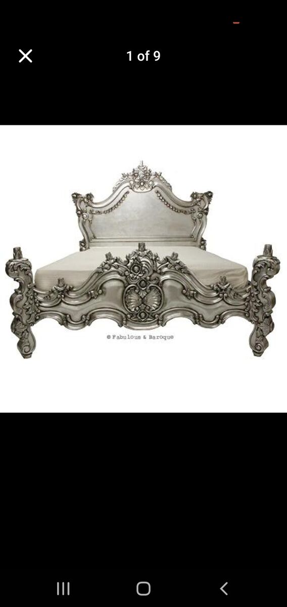 ZelleBought directly from Fabulous and Baroque's website. With its intricate and elaborate carvings, this luxurious mahogany, hand-carved Royal Fortune French silver leaf platform bed is the ultimate piece of furniture to turn any bedroom from bland to grand! Details include flowers, leaves and scrolls.