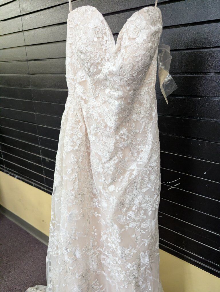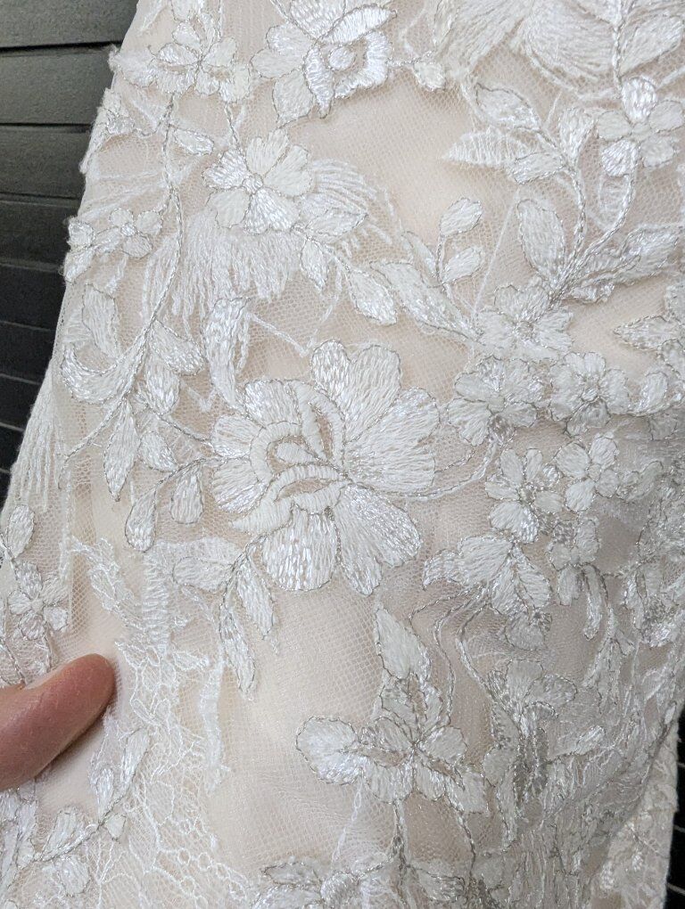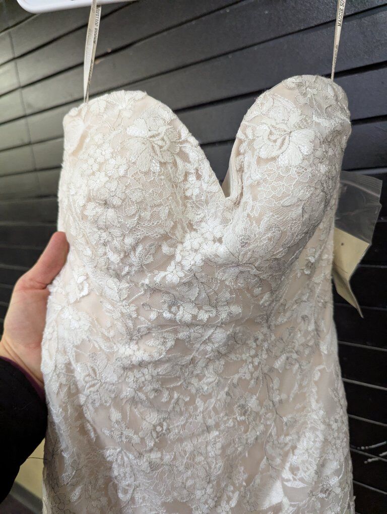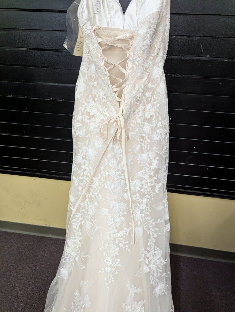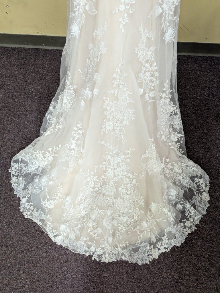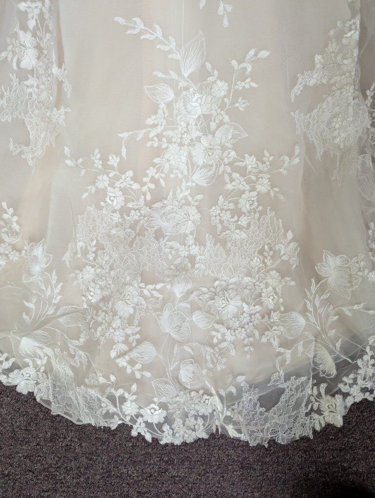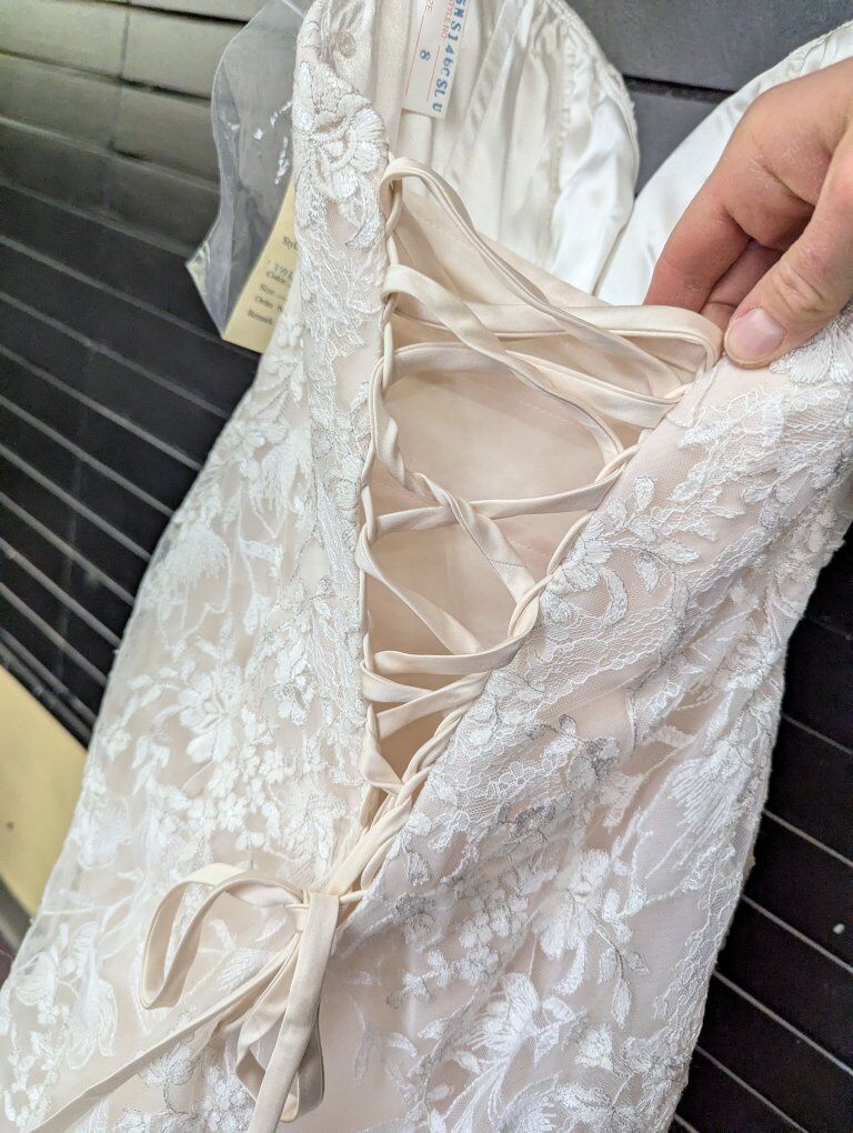 Sweetheart tulle and lace dress. Size 8, ivory over nude. I do not know the dress's history, so it may be used. I did find one stray thread (see photos). I recommend a cleaning and/or press before your big day.