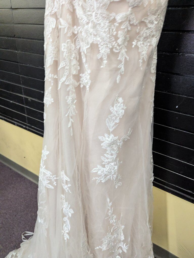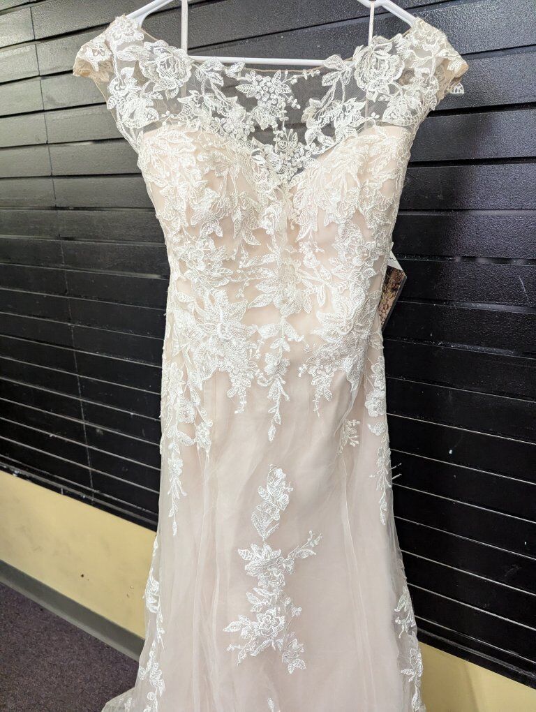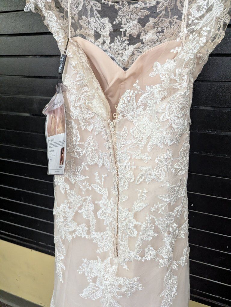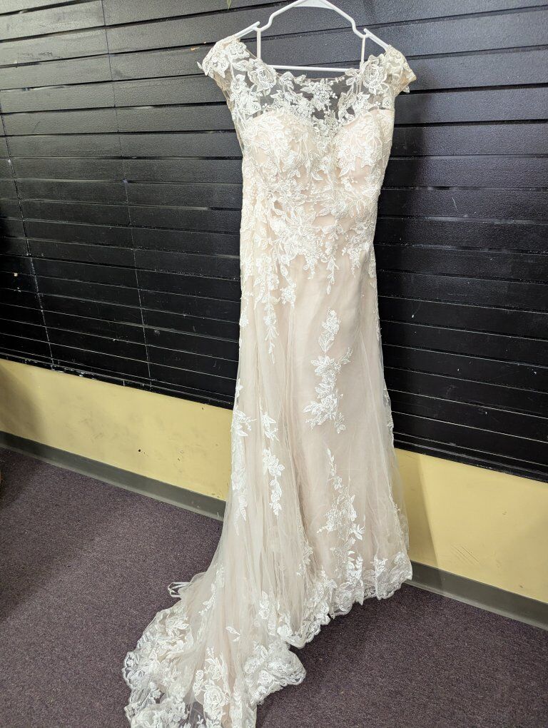Dress is in great shape. I do not know if it is new or if it was used in a bridal shop for try-ons. I don't see any dirt on the dress but recommend a cleaning and/or press before your big day.