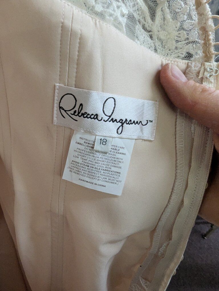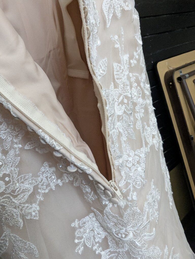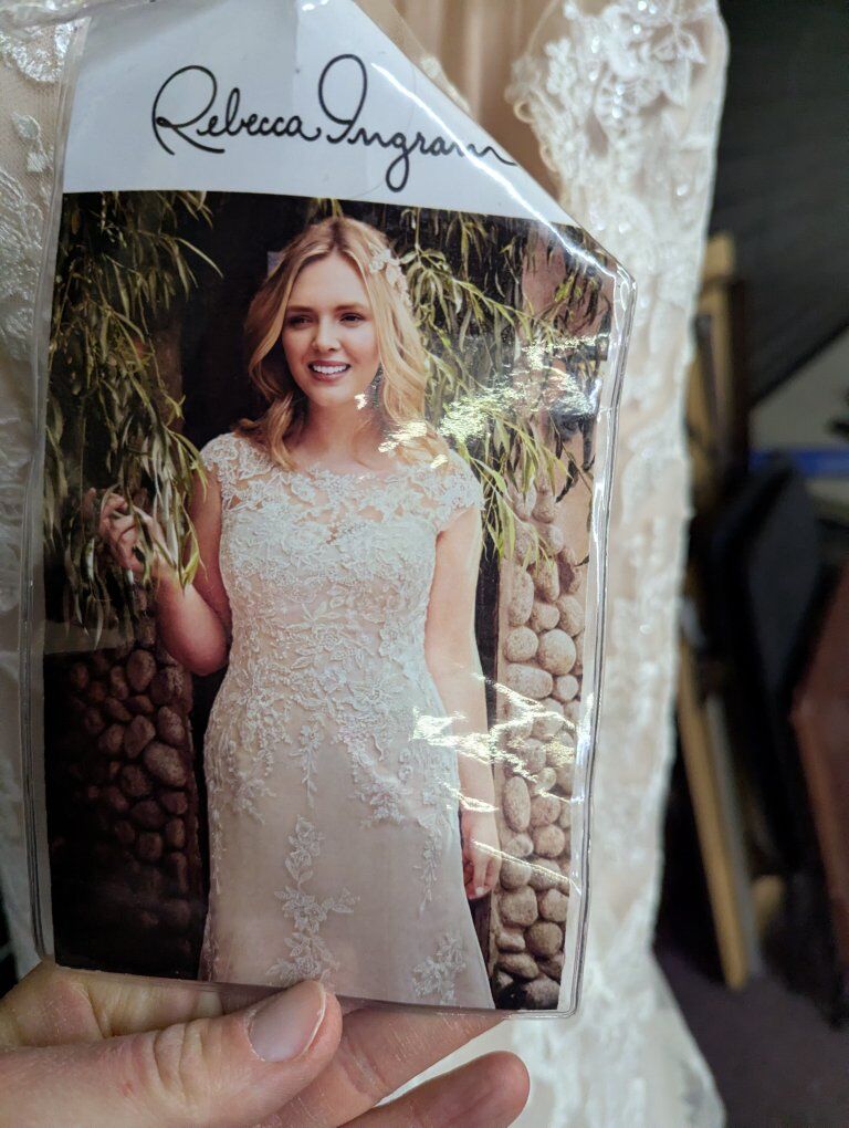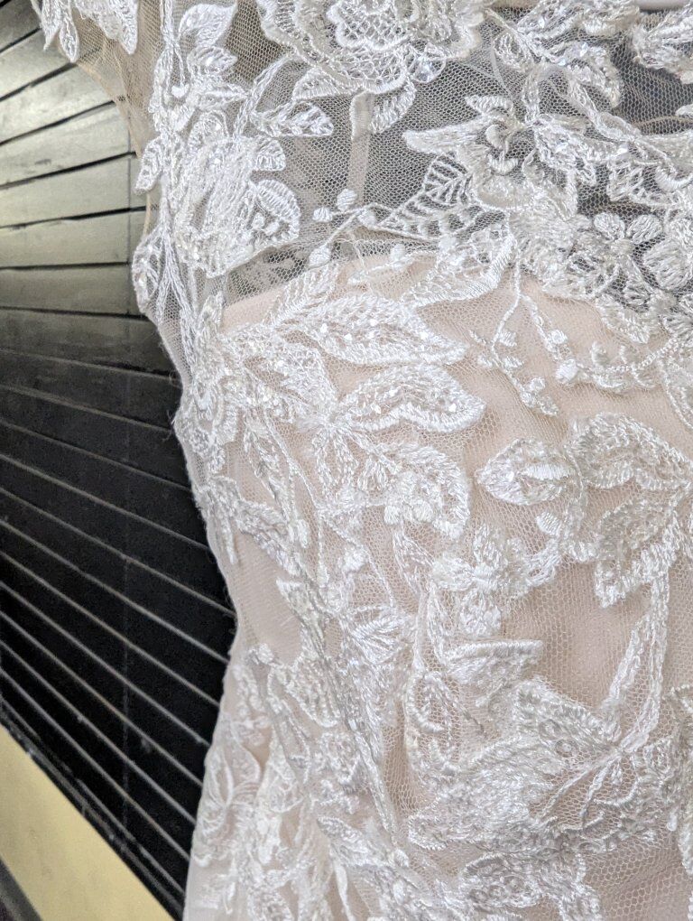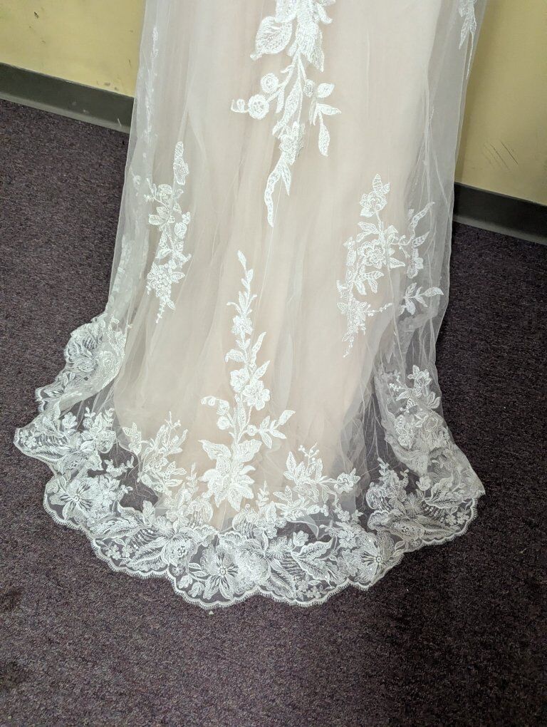 Dress is in great shape. I do not know if it is new or if it was used in a bridal shop for try-ons. I don't see any dirt on the dress but recommend a cleaning and/or press before your big day.