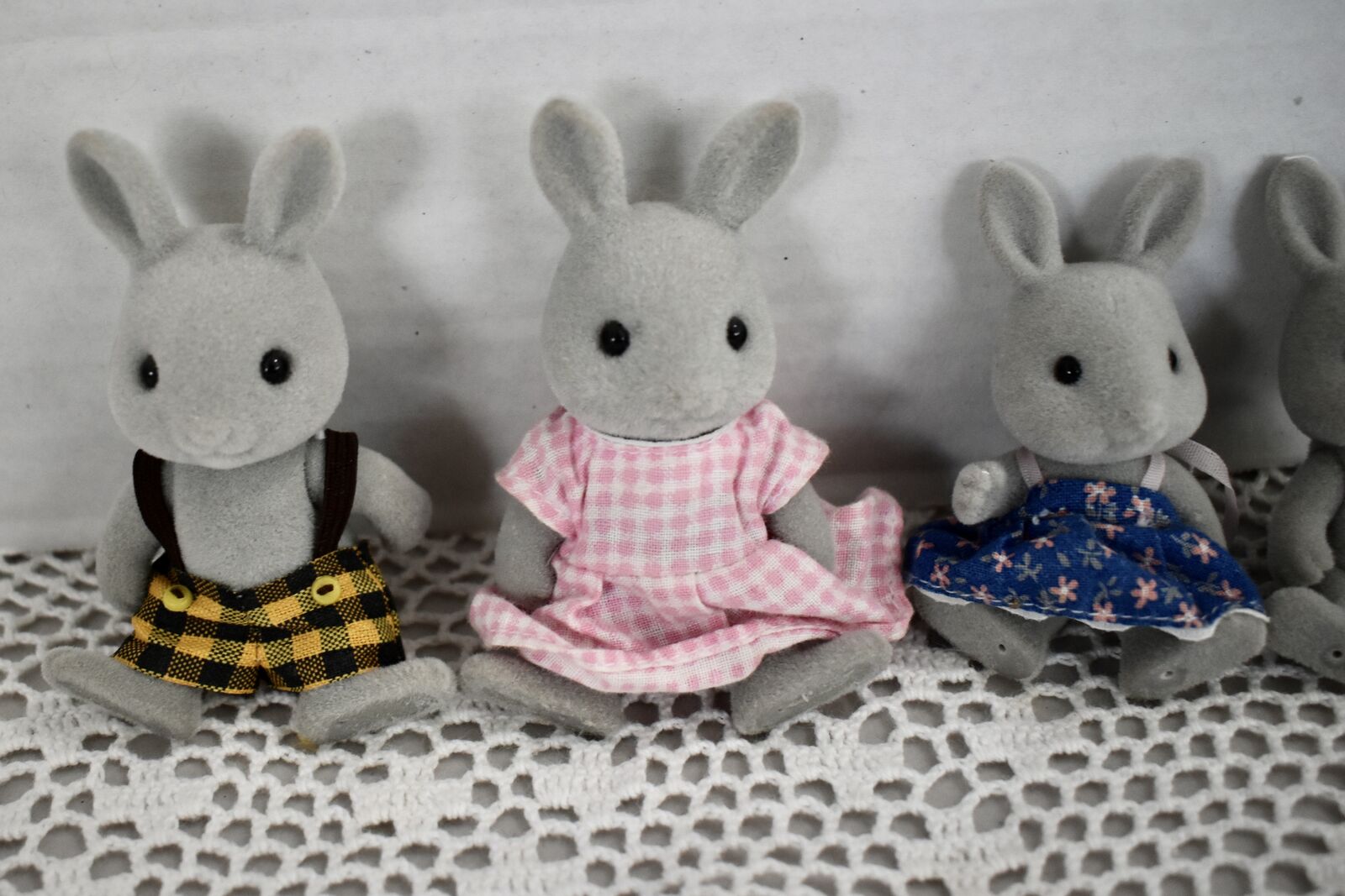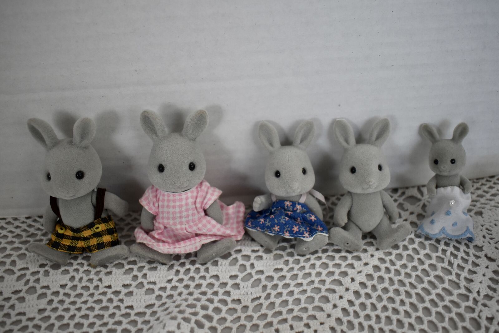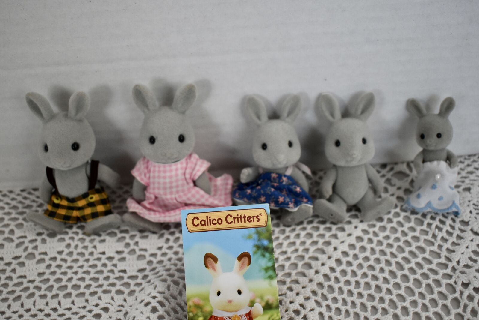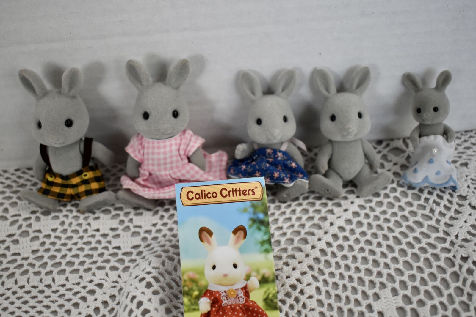***We Have… that we are selling at this time in this listing…SYLVANIAN CALICO CRITTERS RABBIT FAMILY OF FIVE SWEET BUNNY RABBITS with a Daddy Rabbit and a Mommy Rabbit and 3 little ones. Two of the little ones are the same size and then there is a sweet baby Rabbit, also. All in Nice Condition Except for the Baby Rabbit doesn’t have its' original clothes and the little Boy Rabbit doesn’t have its’ clothes.