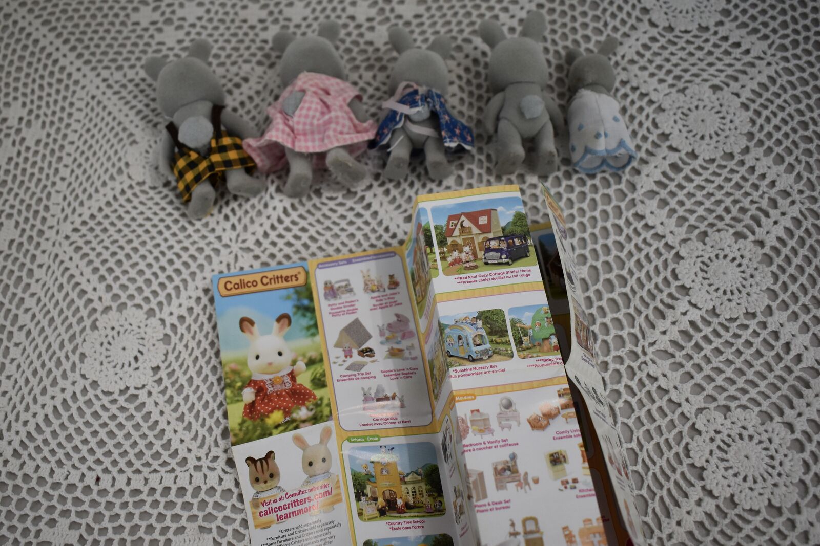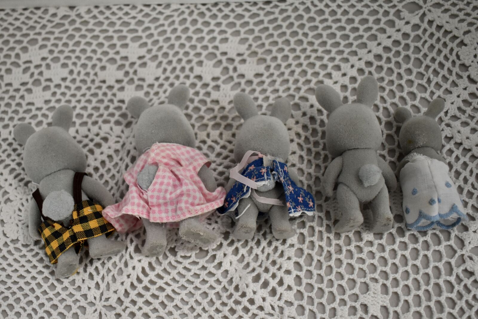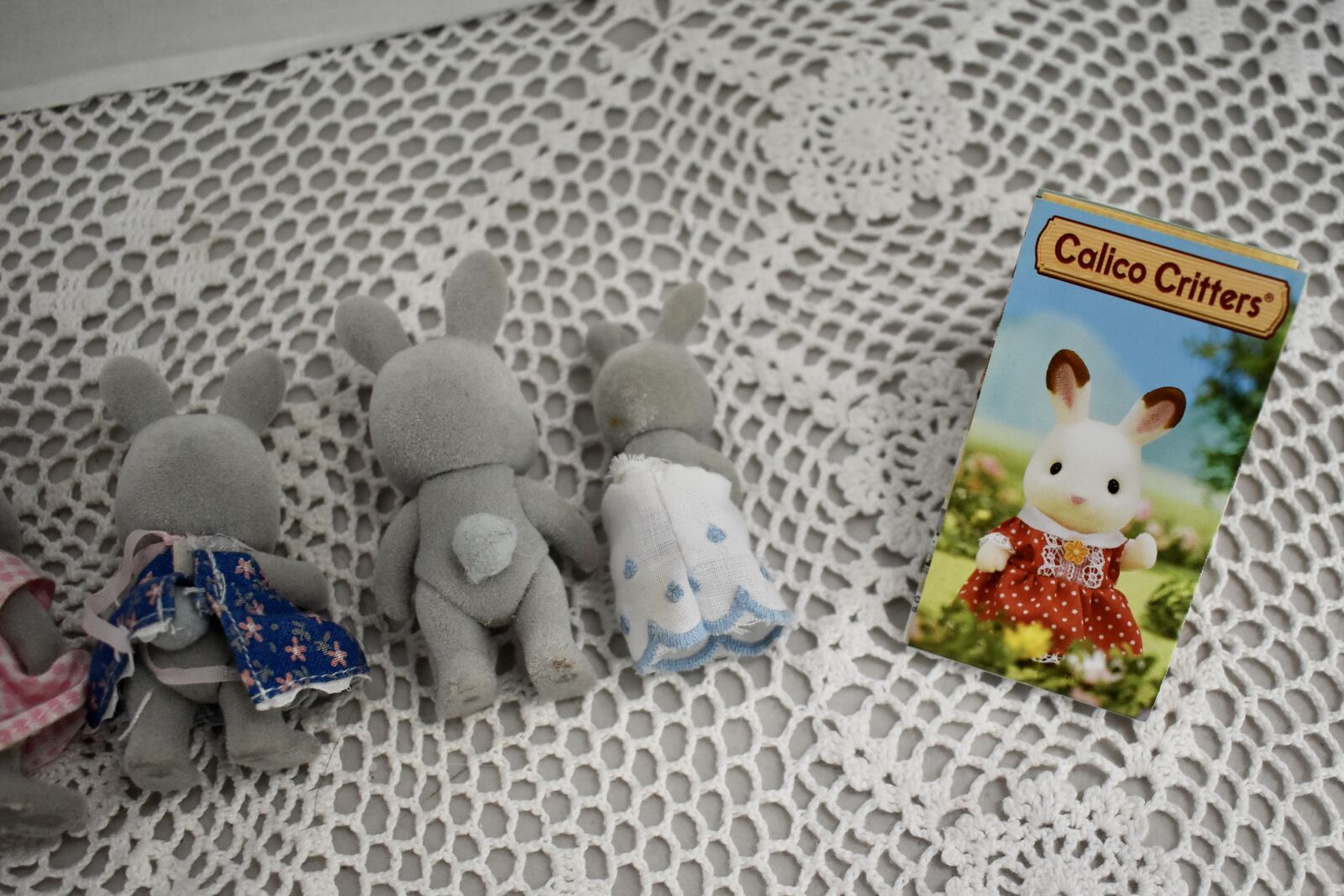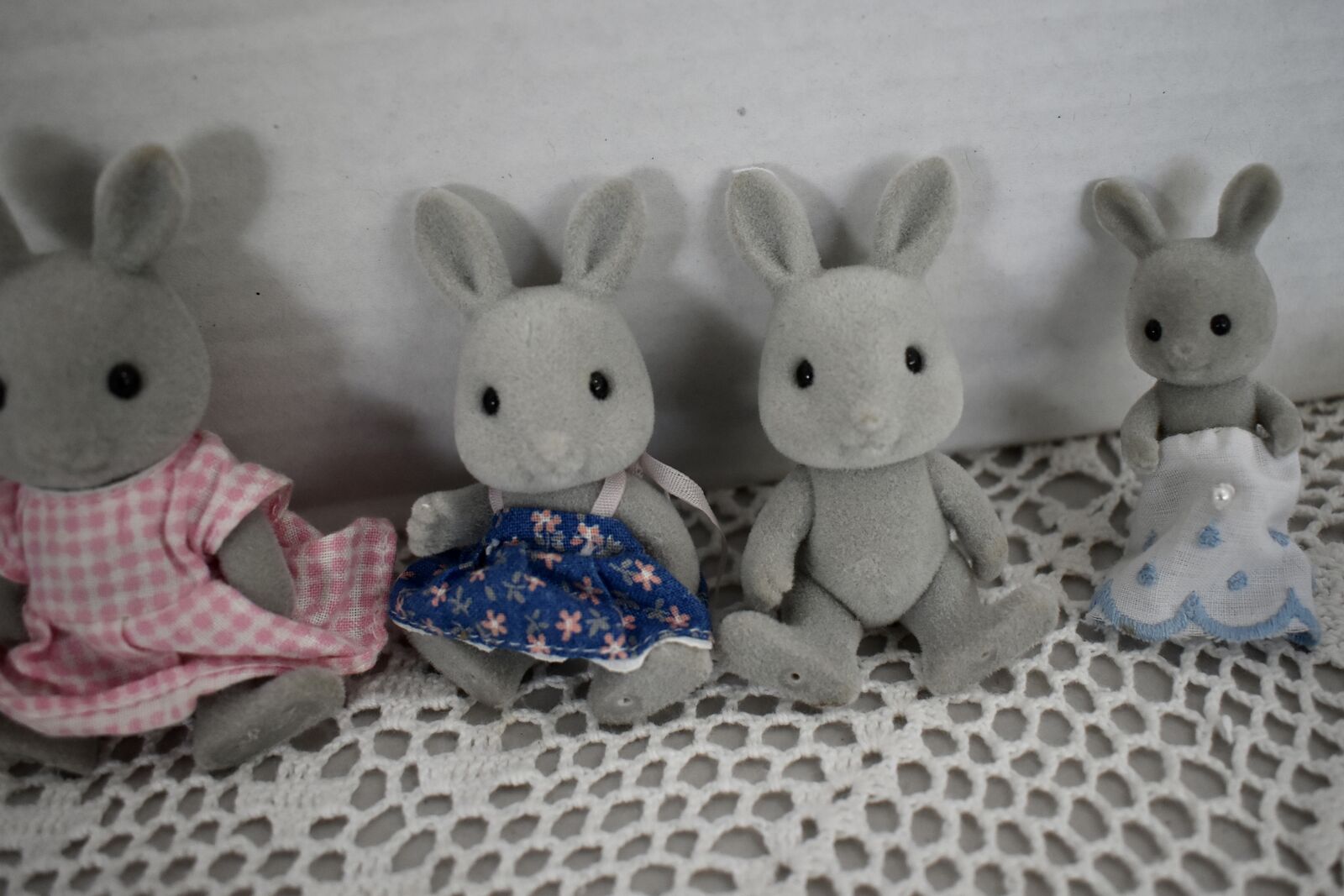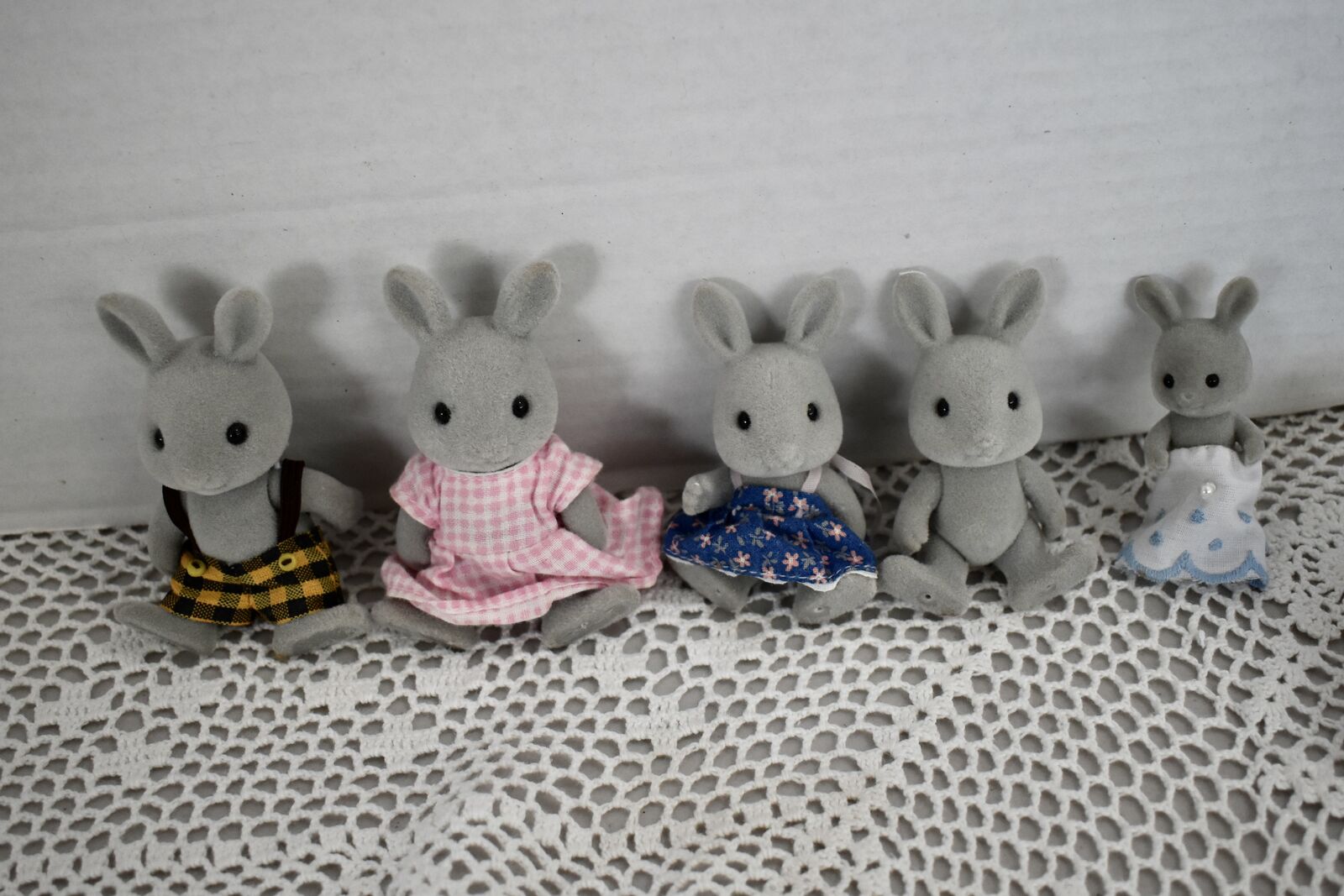 ***We Have… that we are selling at this time in this listing…SYLVANIAN CALICO CRITTERS RABBIT FAMILY OF FIVE SWEET BUNNY RABBITS with a Daddy Rabbit and a Mommy Rabbit and 3 little ones. Two of the little ones are the same size and then there is a sweet baby Rabbit, also. All in Nice Condition Except for the Baby Rabbit doesn’t have its' original clothes and the little Boy Rabbit doesn’t have its’ clothes.