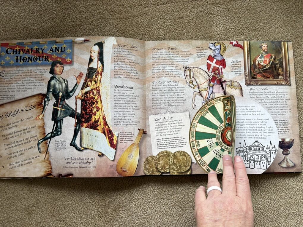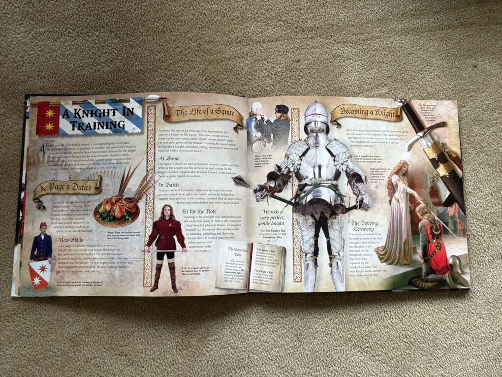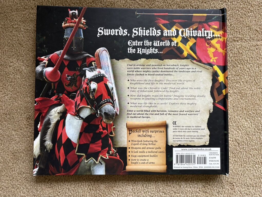 Knights: The Age of the Armoured Warriors. Carlton Books, 2009. Oversized novelty book full of pictures, maps, pop-ups, letters, and fold-outs about knights. Excellent condition. Text only. Cash or Venmo.