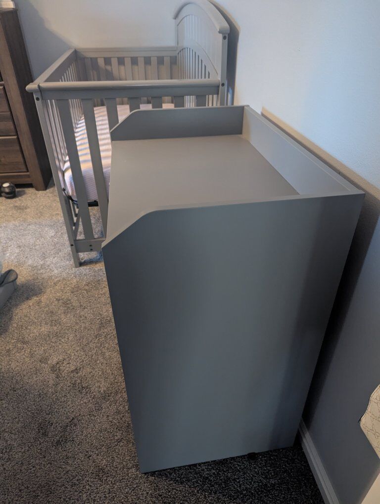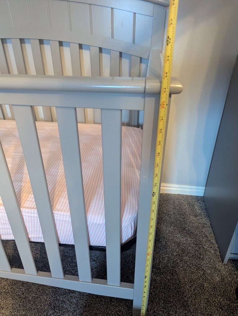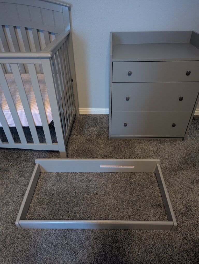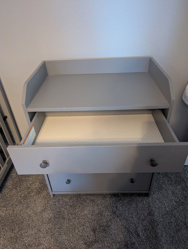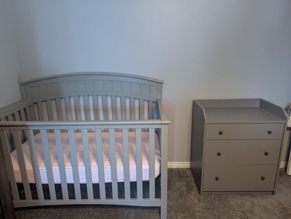 VenmoGrey crib, hardly used mattress (bought new) and dresser in great condition. Well built and sturdy. Measurements in the pictures. We would like to sell all together. But will consider selling separately. We will throw in the never used changing table frame because it doesn't fit on the dresser.