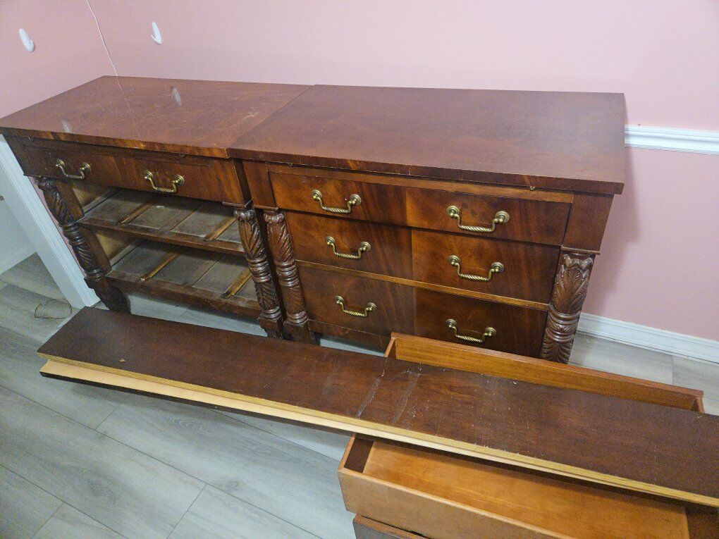 Wooden queen sized bed set. All real wood.(none of that particle board trash.) It comes with 2 dressers and queen size box springs. In good condition (a few dings here and there). Great for small apartments or if you don't need a huge bed.