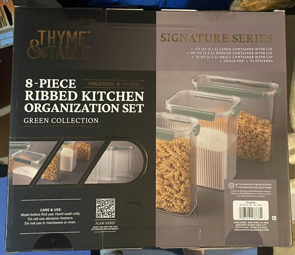 VenmoThyme & Table 8 Piece Ribbed Kitchen Organization Set from their Signature Series in the Green Collection. It includes three different sized containers with lids (173 oz, 167 oz, 76 oz), a chalk pen, and 9 stickers for labeling. The containers feature a clear ribbed design, are made from food-safe PET plastic, and are stackable for efficient storage. The set is designed for pantry organization, keeping dry goods fresh with airtight lids. For care, they are hand wash only and are not suitable for use in the microwave or oven.
