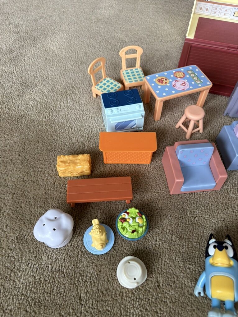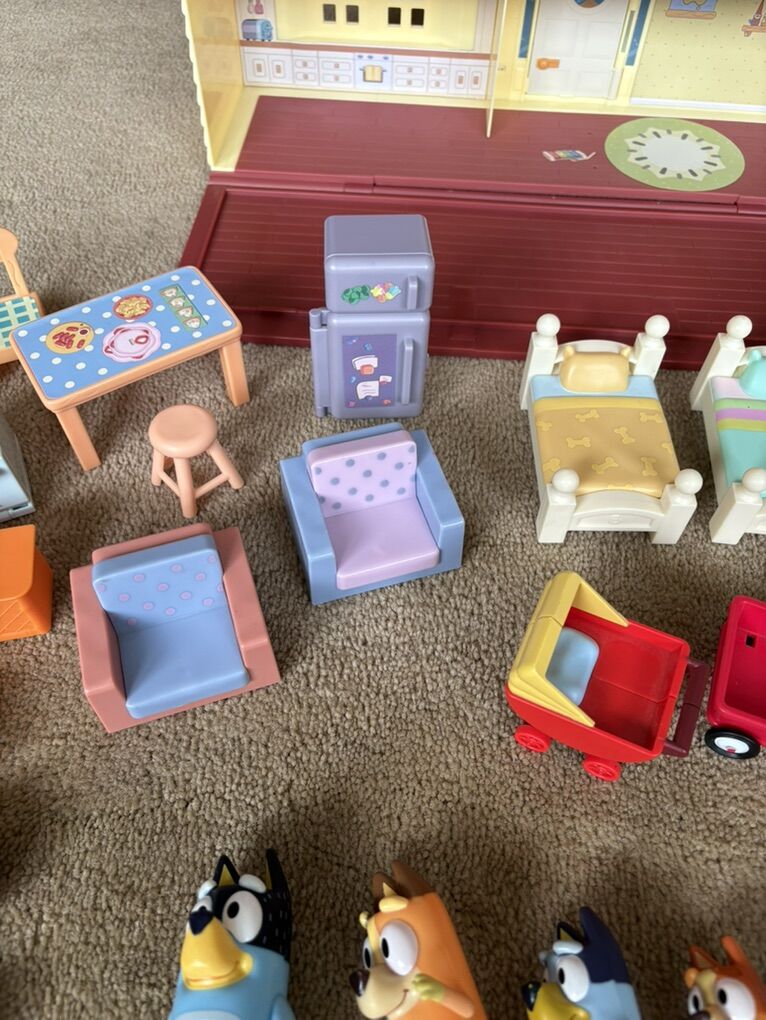 Bluey House Set. Includes fold-up house, furniture, accessories, and Heeler family & friends figures from various sets. All in very good condition. Text only. Cash or Venmo.
