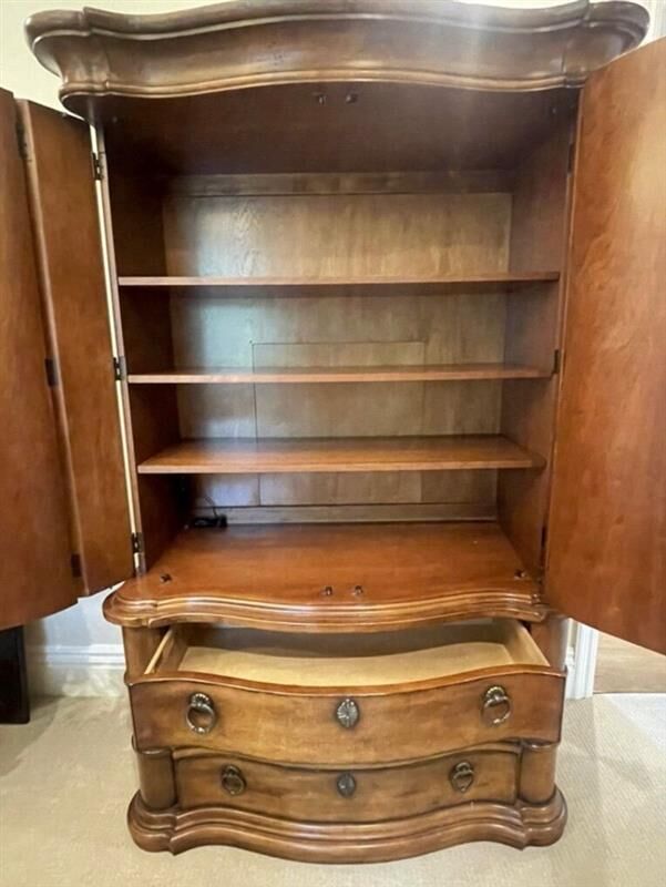 Stunning Century Furniture armoire in excellent, like-new condition. This gorgeous piece features rich walnut-toned wood with beautiful carved detailing on the double doors and a serpentine-front base. Inside you'll find 3 adjustable shelves — perfect for a TV, display, or storage. The base includes 3 bow-front drawers with antique brass ring pulls for plenty of extra storage. Dimensions: 83" H x 52" W x 24" D. A true statement piece that works in a bedroom, living room, or office. Pickup only — will need a truck or trailer.