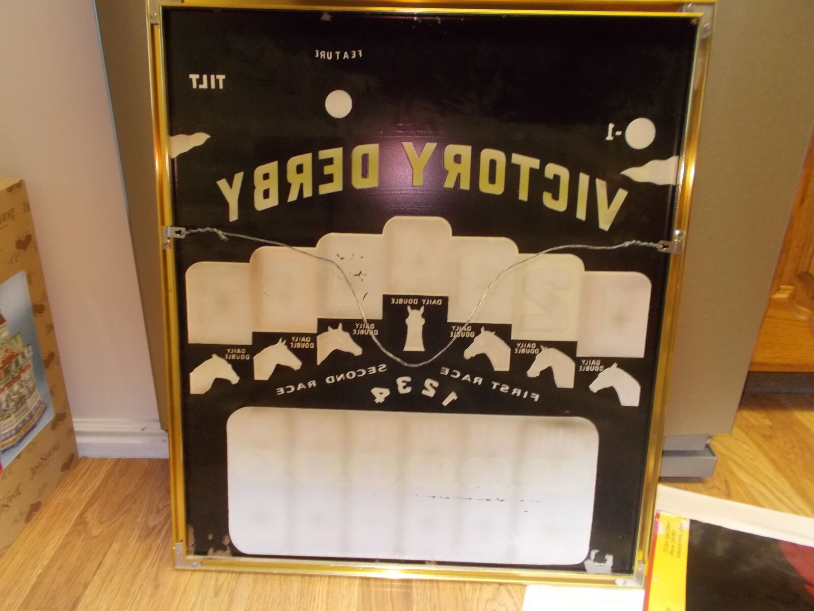 This is a very rare 1946 Pinball Victory Derby Back Glass. It is in really nice condition. It is framed so if you want to hang it, it has the hanger on back. Measurements 27x23x1. If interested please phone or text 801-823-7198 and ask for Laura. Thanks