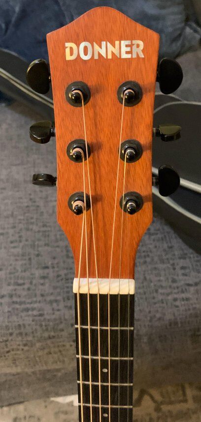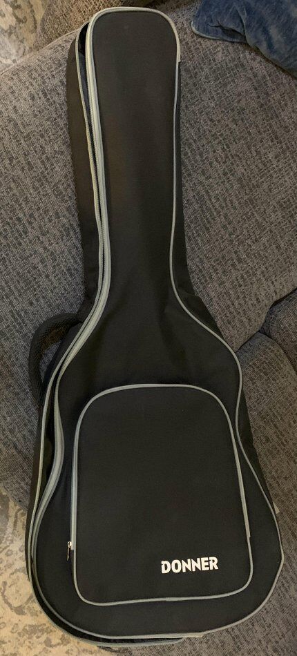 Donner DAG-1C dreadnaught guitar with gig bag. This is a great guitar for the price sounds great and plays well. This is a guitar I got when I first started playing I’m selling due to having a new one and I just don’t play this anymore. The wood grain is great on this! I particularly like the look of the back. The gig bag isn’t anything special but it is pretty handy for a little bit of extra protection and a easy way to carry the guitar around, it’s got a handle on the side and some backpacks straps on the back. I absolutely love this guitar! I’ve played the heck out of it and would recommend it to anyone getting into playing or as a second guitar that you don’t need to worry about throwing around.
