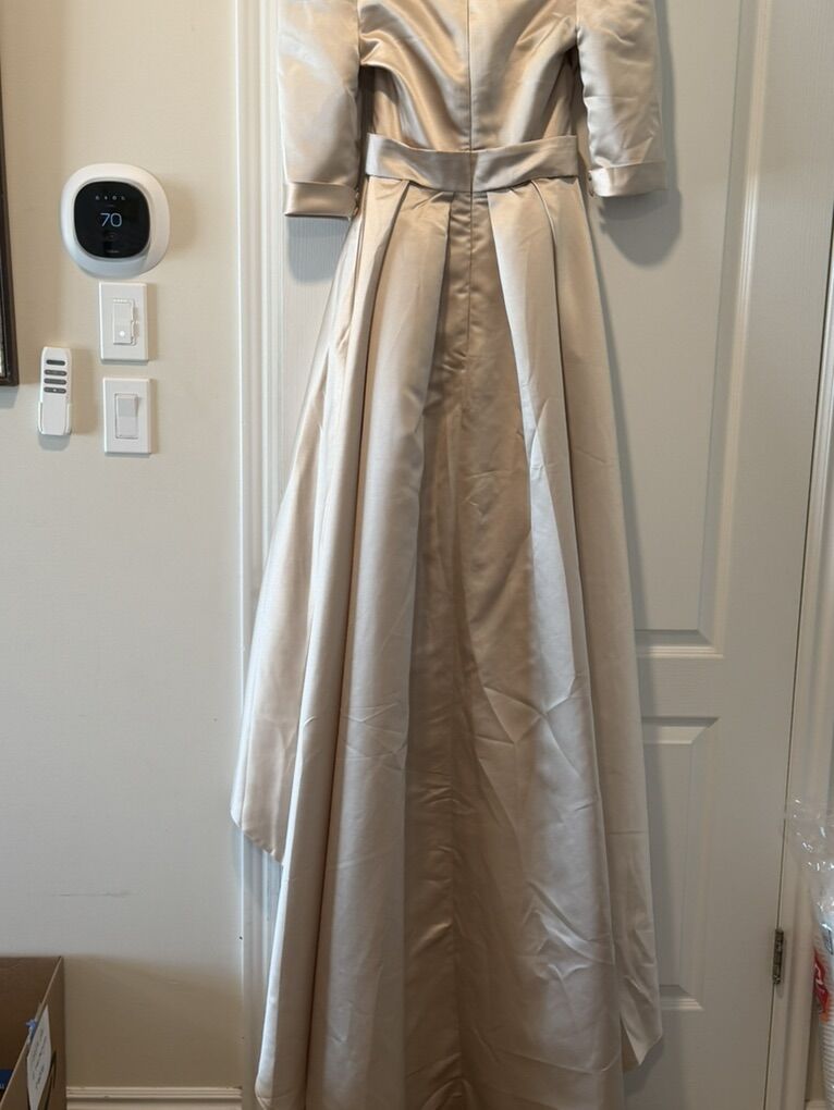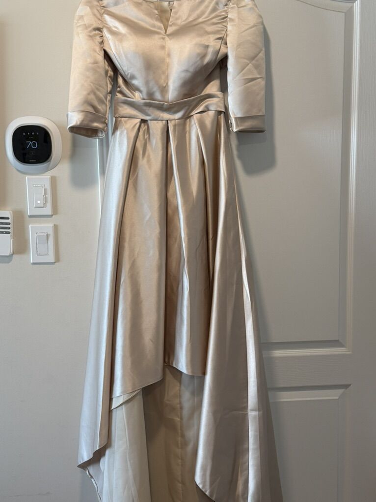 This dress did not come in time for my daughter’s wedding, so it is unworn. Hi/low dress with long pretty train in the back. 3/4 sleeve Champagne color (beige gold) Got From cocomelody Paid $130 Asking $60
