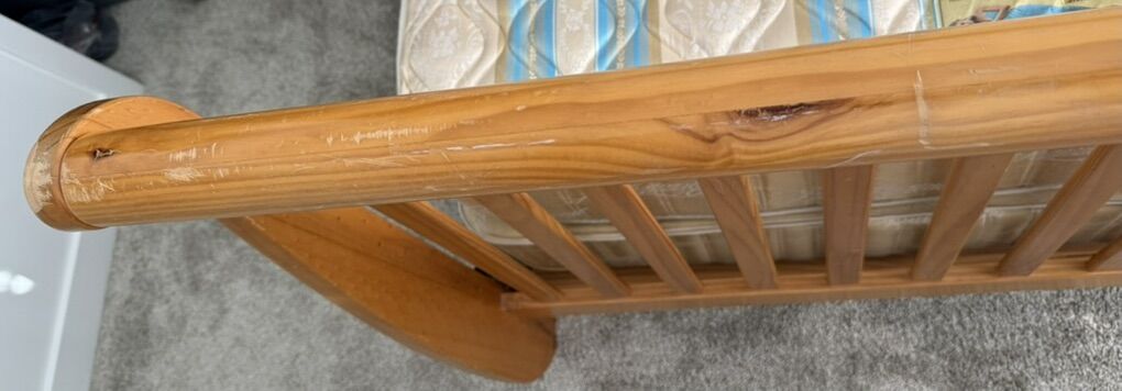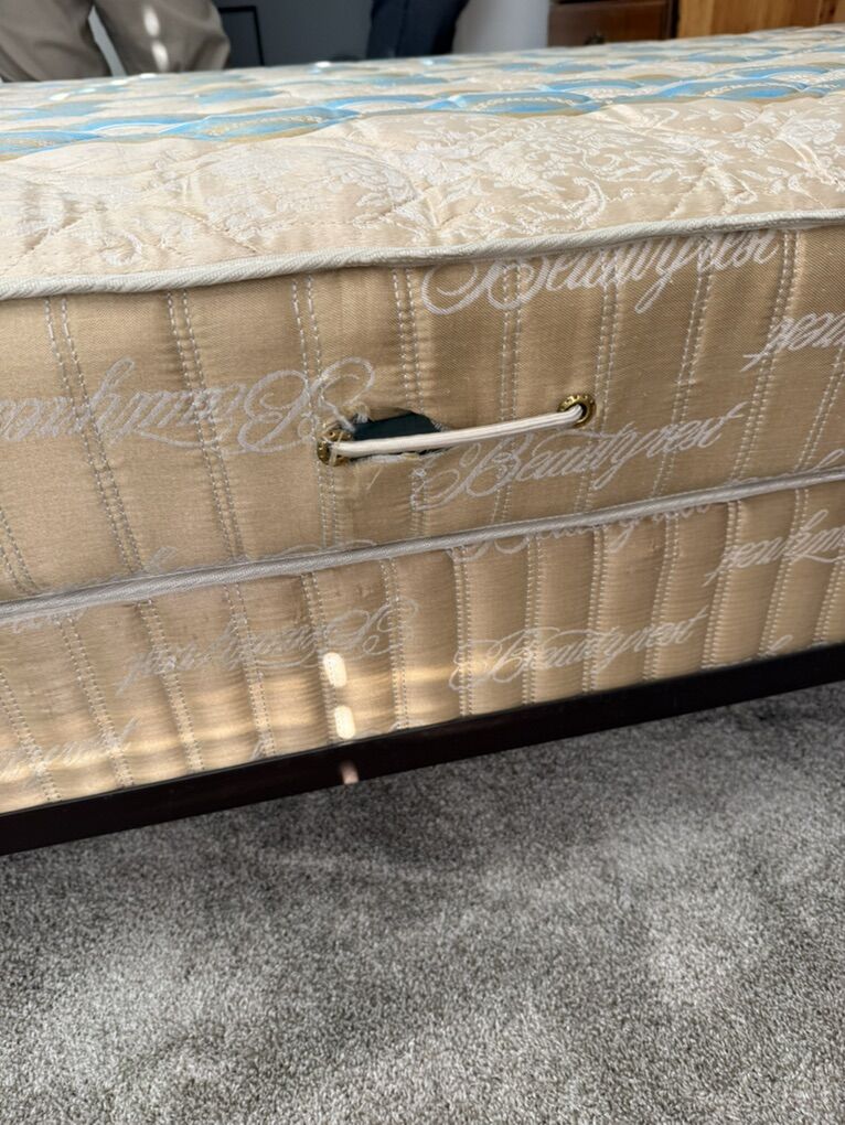 VenmoBed frame is two ends of a convertible crib that I received pretty scratched up, but it’s sturdy. The mattress is a Beautyrest. It’s old but has not been used very often. One handle did get ripped while moving. It is in good condition otherwise. Clean, smoke-free home.