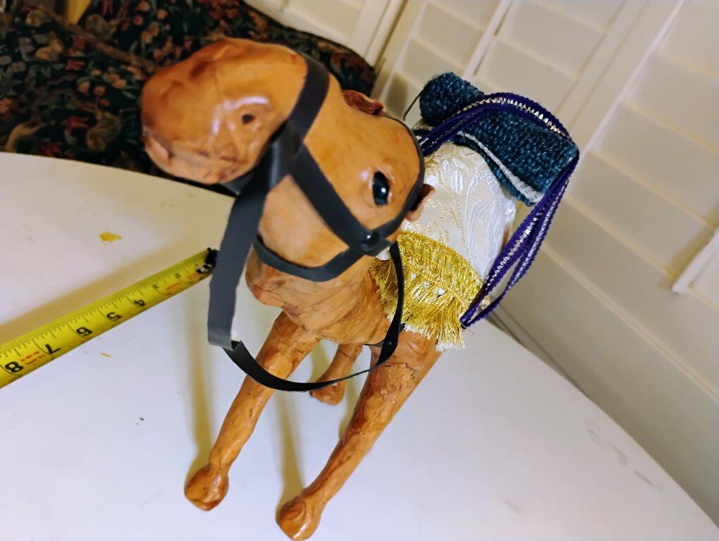 Handcrafted Camel decor made in India. Measuring 11 inches in height, this camel is the perfect size for display on a shelf or mantel. Its charming and intricate design makes it a unique and eye-catching piece of decor. We will meet near Foothill village, sorry I don't have Venmo, I take cash only. Thanks for looking!