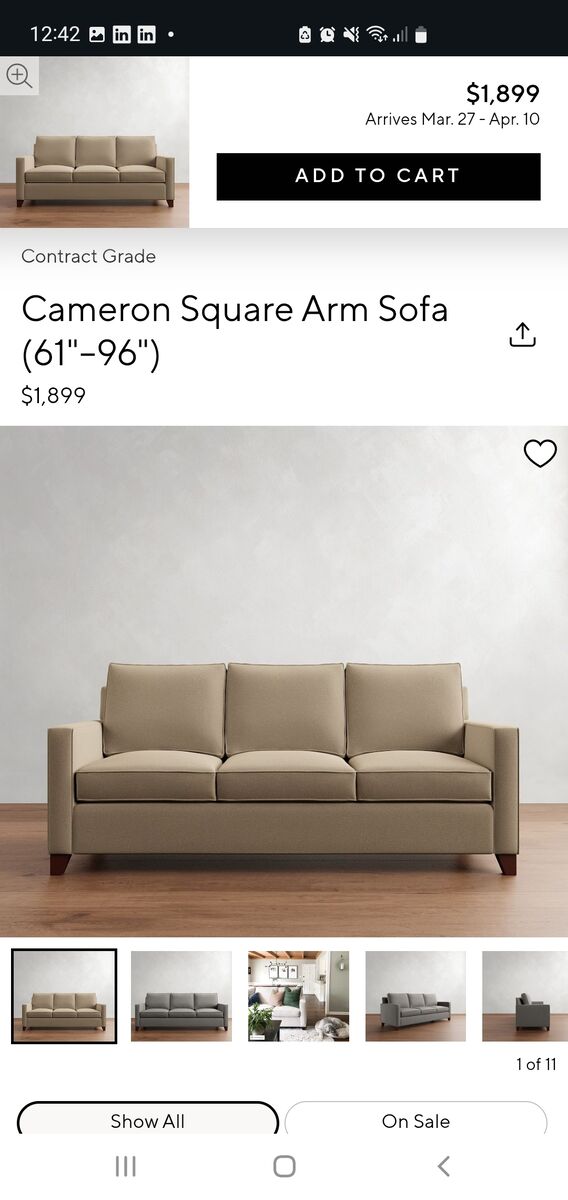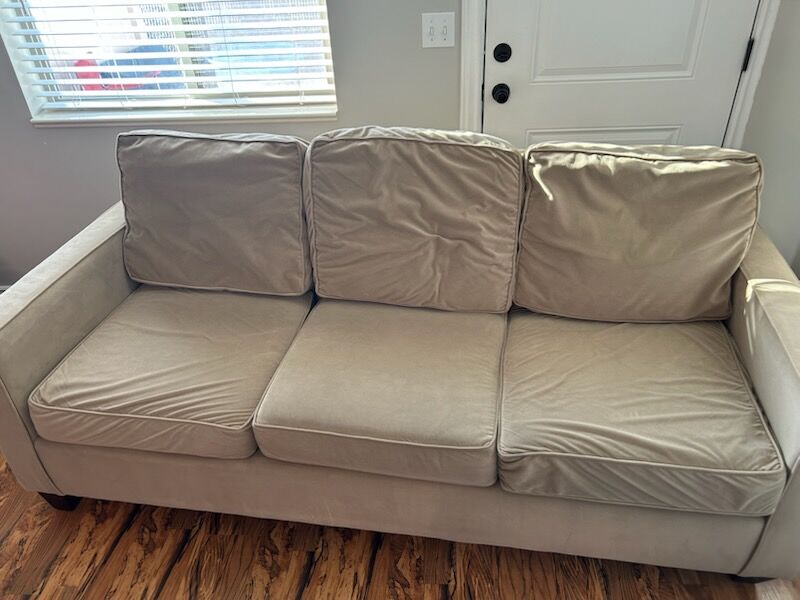 After 3 years of daily use this Pottery Barn couch is clean, sturdy, and comfortable. The suede feels soft and luxurious, and the cushions are remarkably firm and supportive.