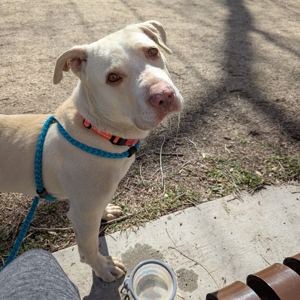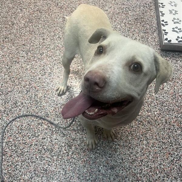 Daryl is a handsome white Lab mix boy with a heart as big as his happy tail wags. This gentle guy lives to love. Whether he’s leaning into you for pets, quietly sitting by your side, or greeting you like you’ve been gone for years (even if it was just a trip to the mailbox), Daryl makes every moment brighter. He’s the perfect mix of playful and polite. Daryl enjoys a good game of fetch and exploring the yard, but he’s just as content curling up next to you for a cozy nap. He has wonderful manners, a kind nature, and a calm, loving personality that makes him easy to adore. Daryl would thrive in a home where he can be part of the family — he’s the kind of dog who wants to be involved in everything, from movie nights to morning coffee on the porch. If you’re looking for a loyal companion who will shower you with unconditional love, Daryl is your guy. If you’re ready for a sweet, affectionate, tail-wagging best friend, Daryl is waiting to meet you!