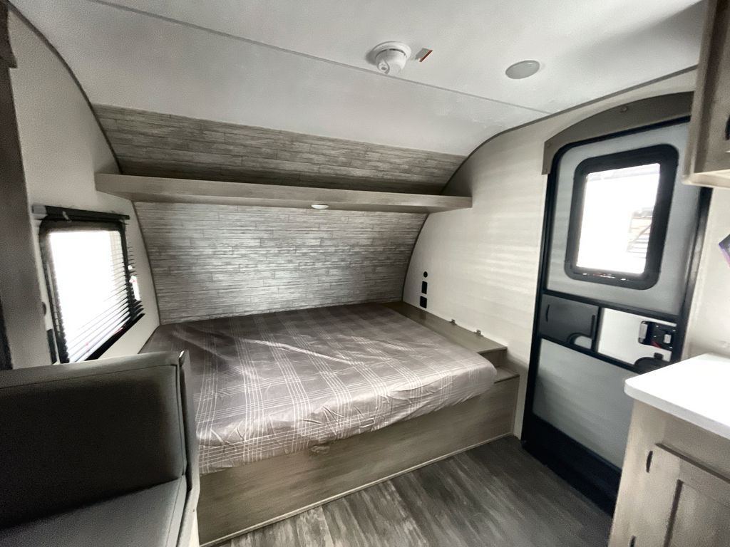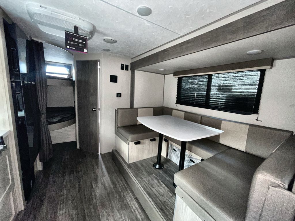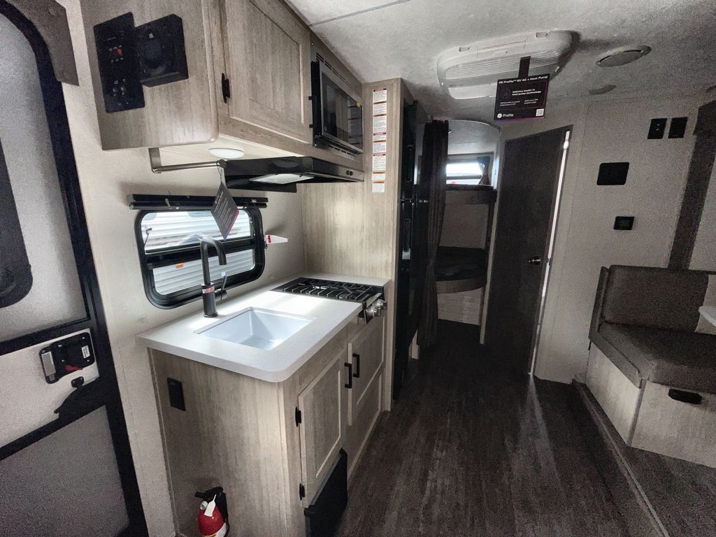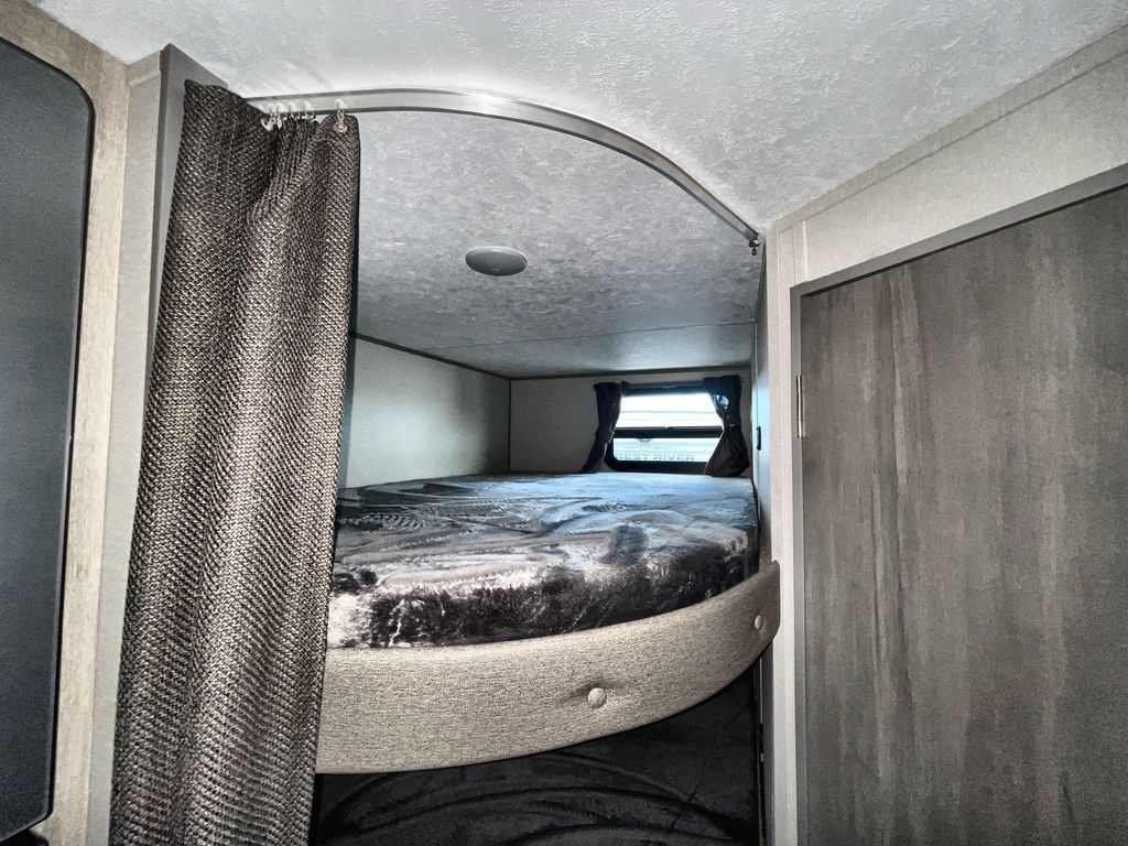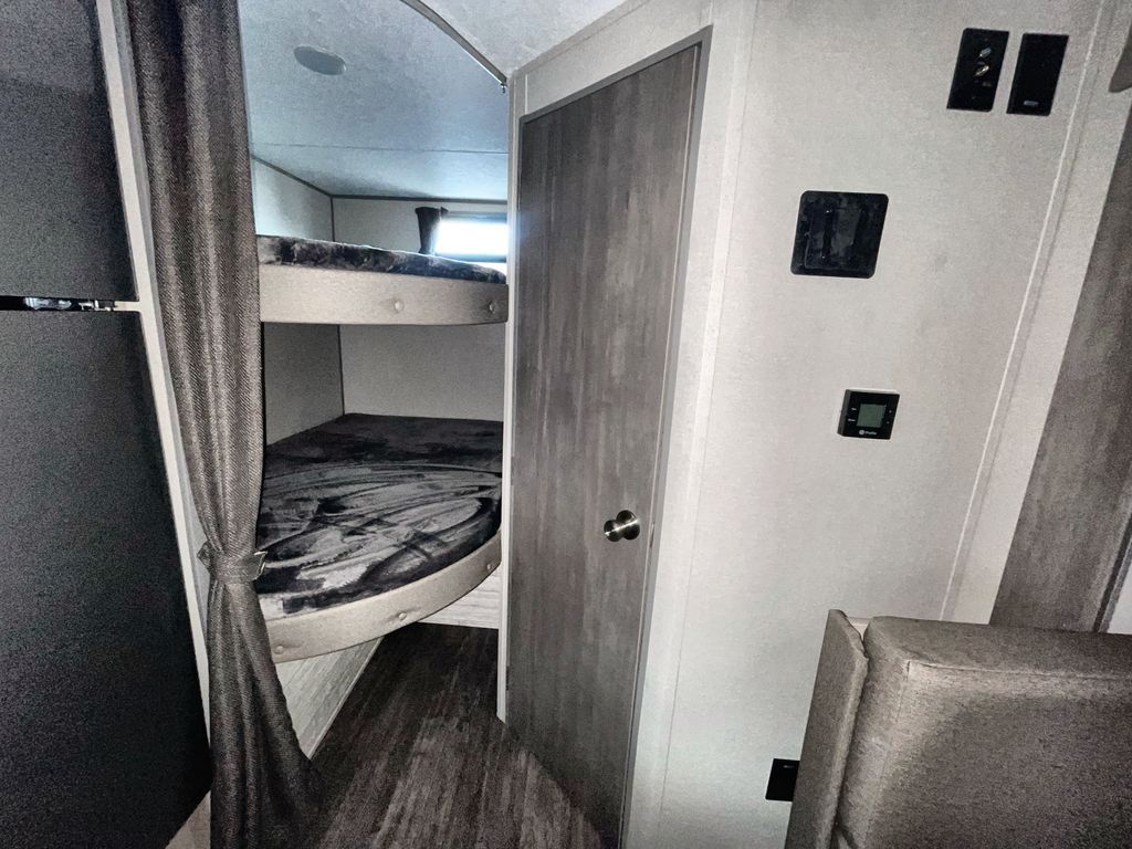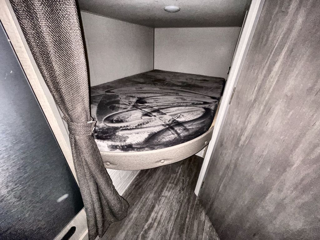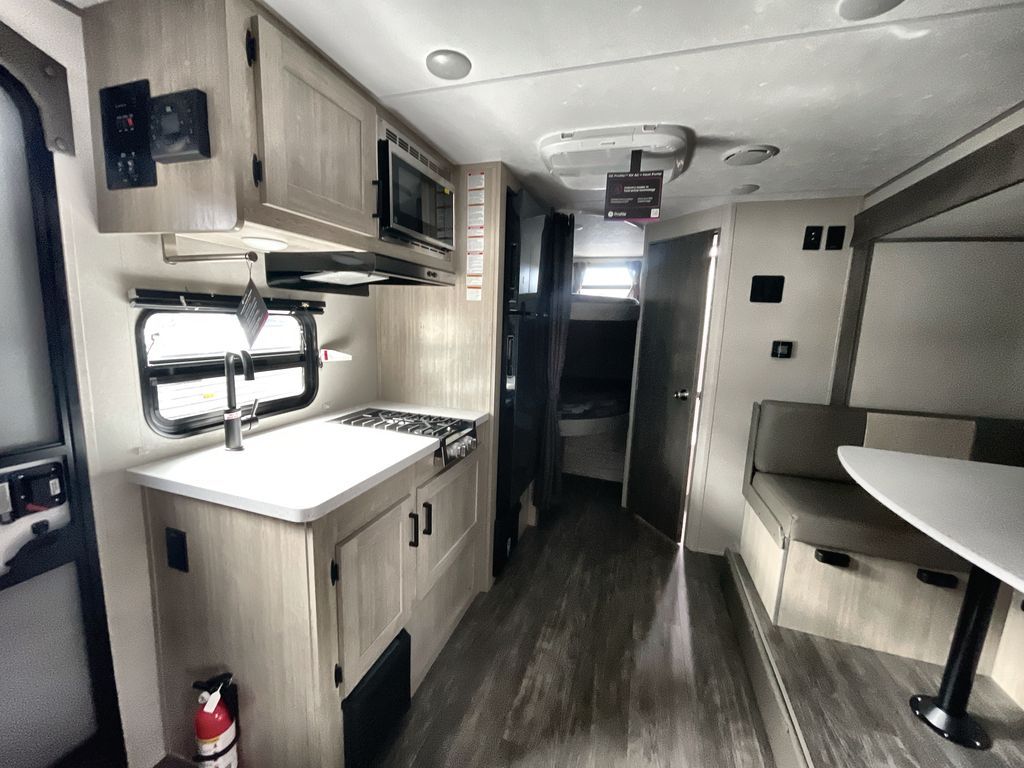 This travel trailer is ideal for anyone seeking a comfortable, stress-free getaway. Gather around the U-shaped dinette for meals, games, or movie nights – it's the perfect spot to make memories with loved ones. You can unwind in the full bathroom, complete with a tub/shower combo, or catch some Z's on the double-size bunk beds, perfect for kids or guests. The kitchen is equipped with a refrigerator, microwave, and sink, making it easy to whip up meals on the go. Overhead cabinets provide ample storage for your culinary needs. Finally, drift off to sleep under the stars, feeling refreshed and rejuvenated in the comfy queen bed surrounded by storage galore for your belongings.