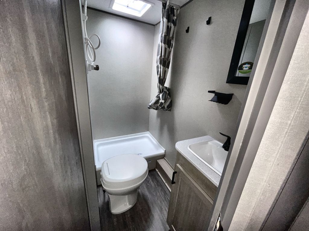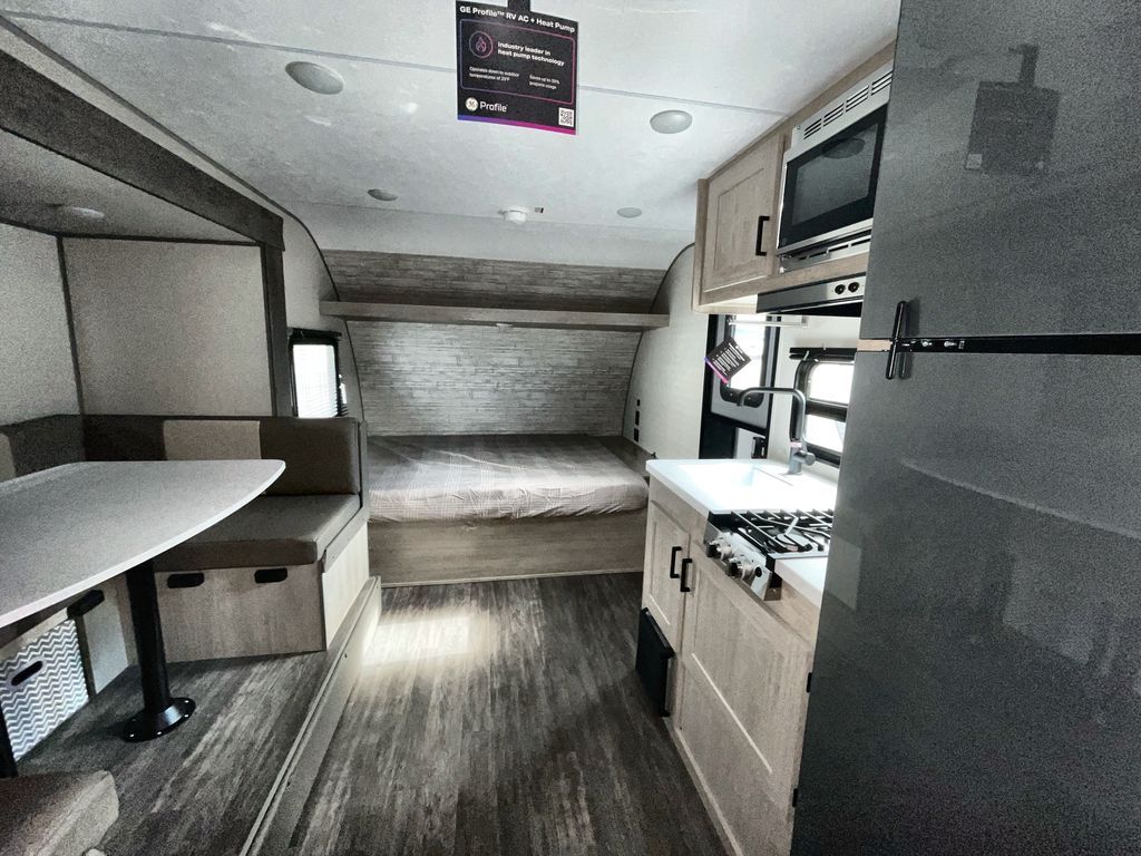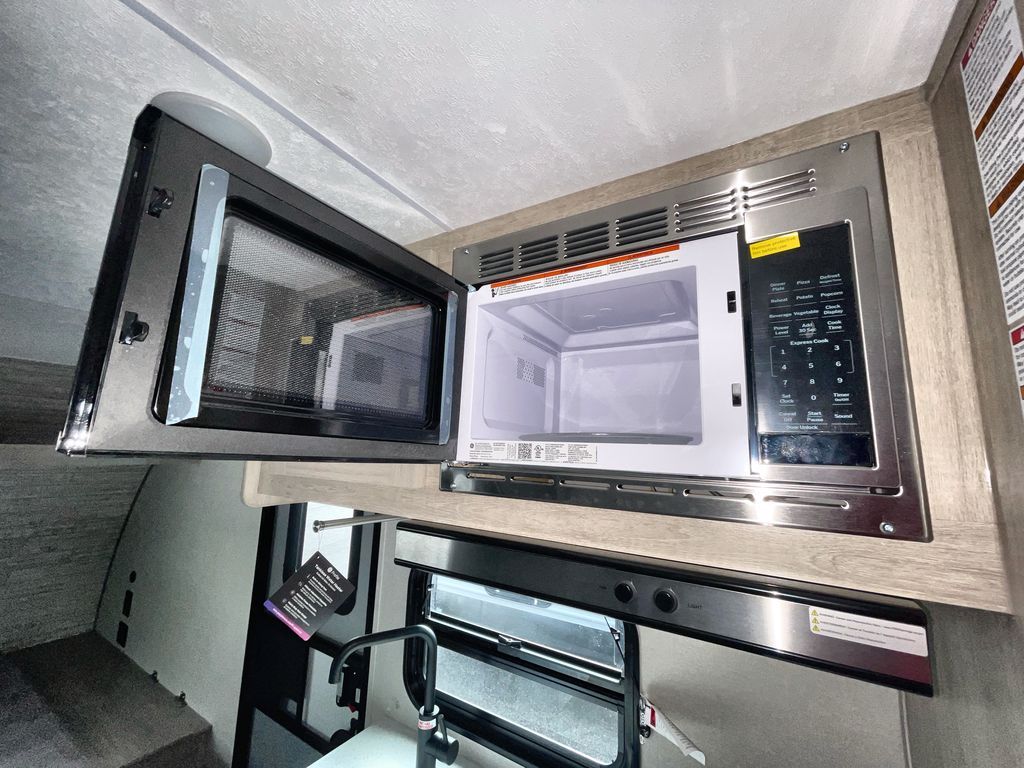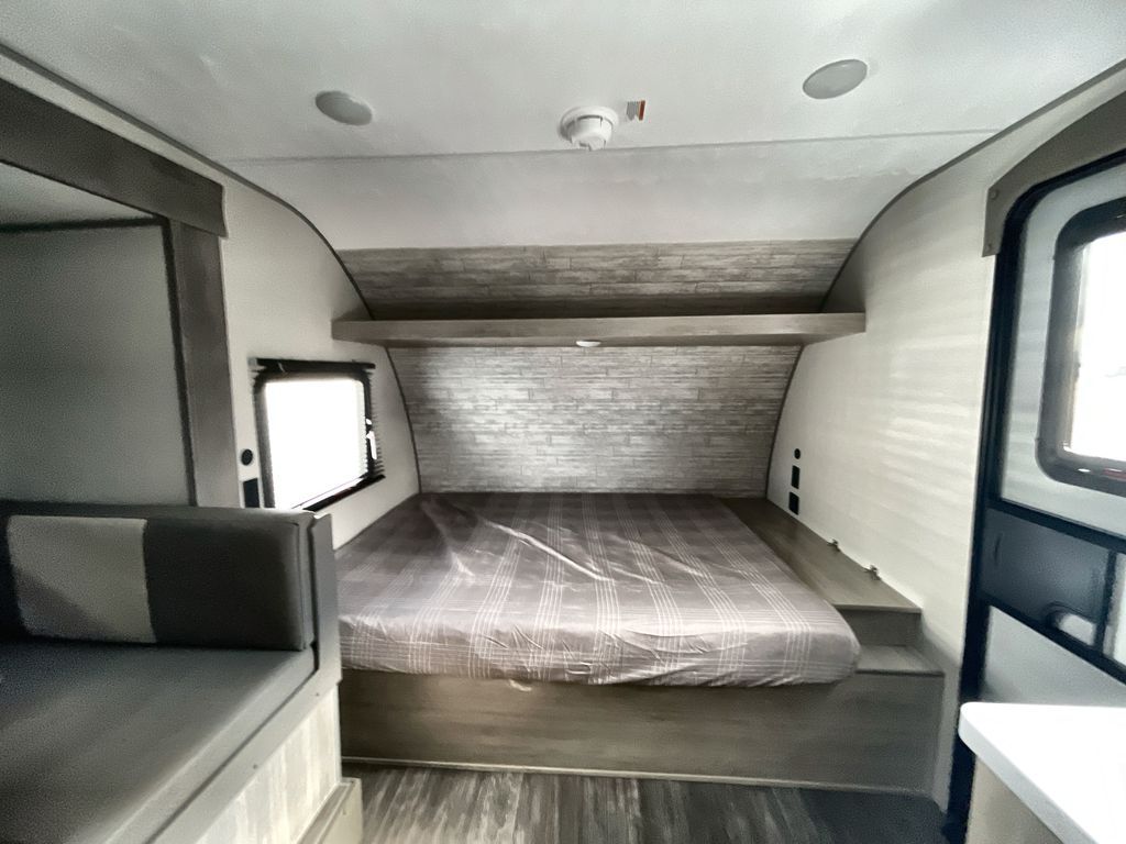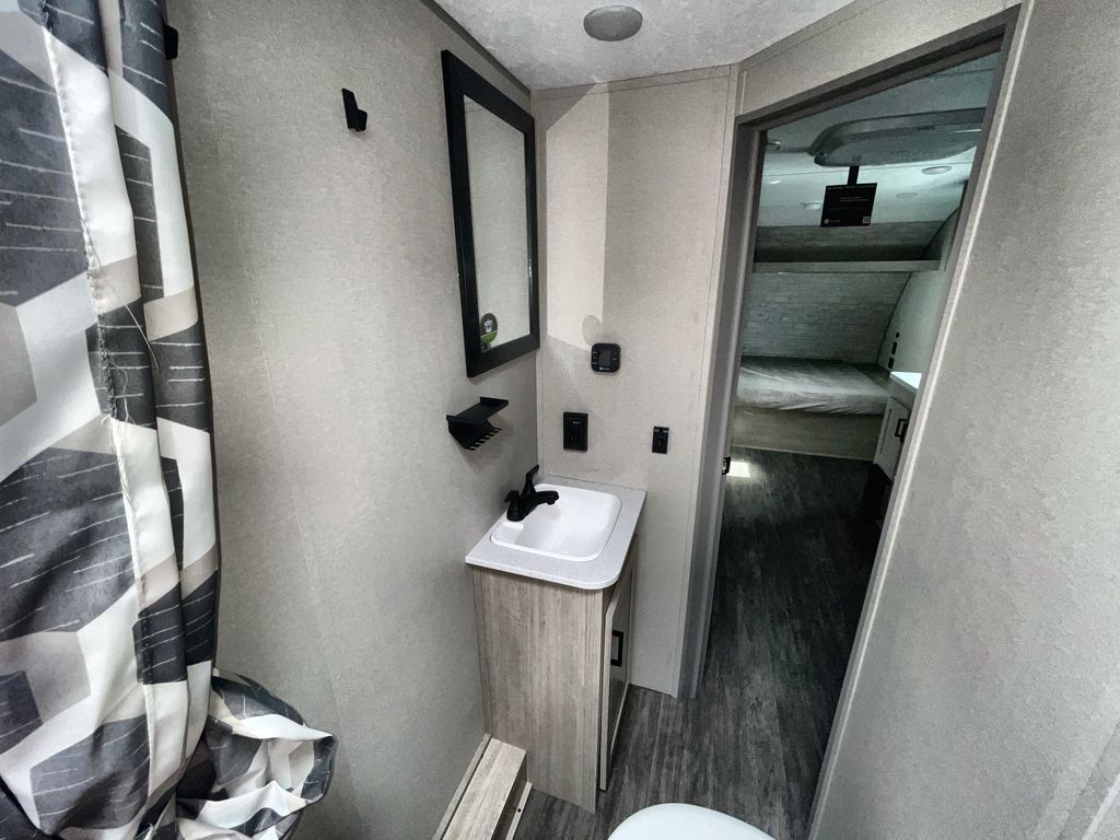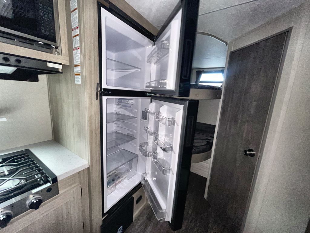 This travel trailer is ideal for anyone seeking a comfortable, stress-free getaway. Gather around the U-shaped dinette for meals, games, or movie nights – it's the perfect spot to make memories with loved ones. You can unwind in the full bathroom, complete with a tub/shower combo, or catch some Z's on the double-size bunk beds, perfect for kids or guests. The kitchen is equipped with a refrigerator, microwave, and sink, making it easy to whip up meals on the go. Overhead cabinets provide ample storage for your culinary needs. Finally, drift off to sleep under the stars, feeling refreshed and rejuvenated in the comfy queen bed surrounded by storage galore for your belongings.