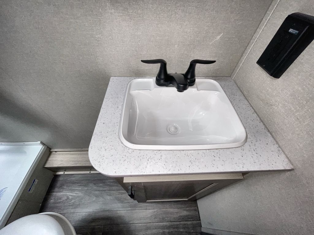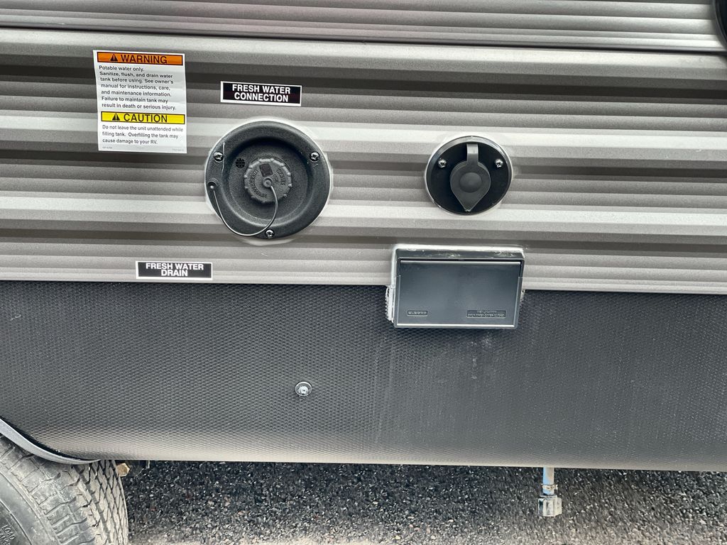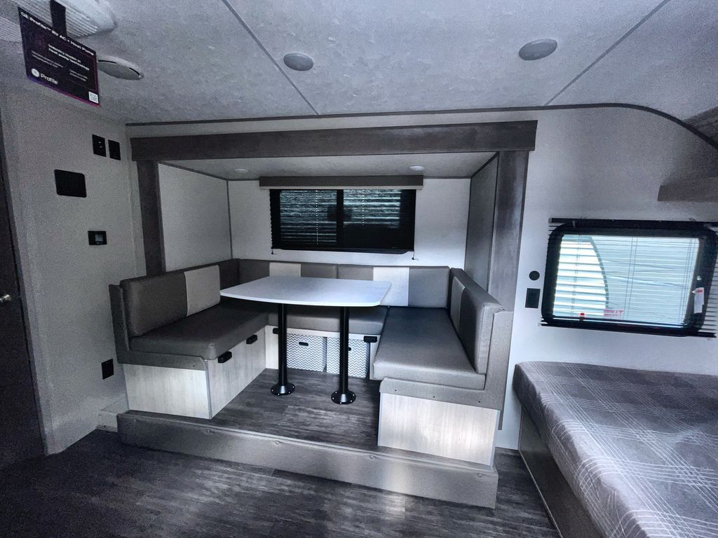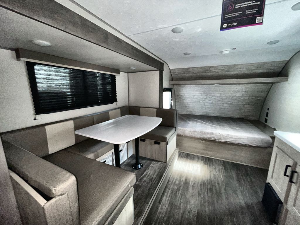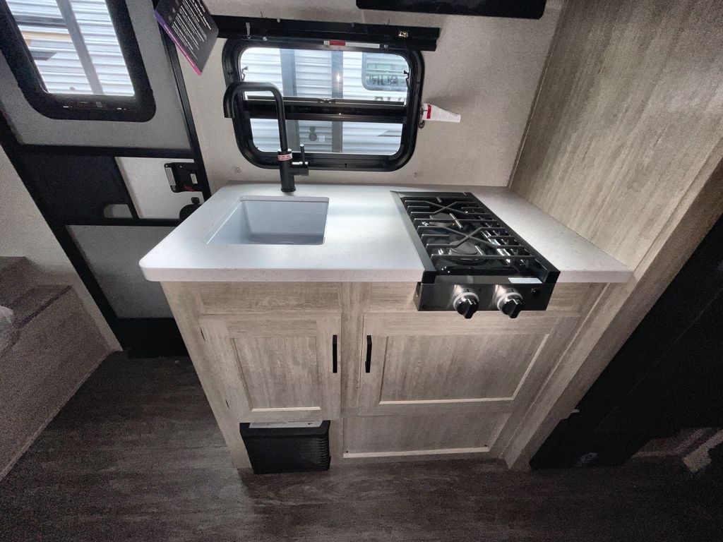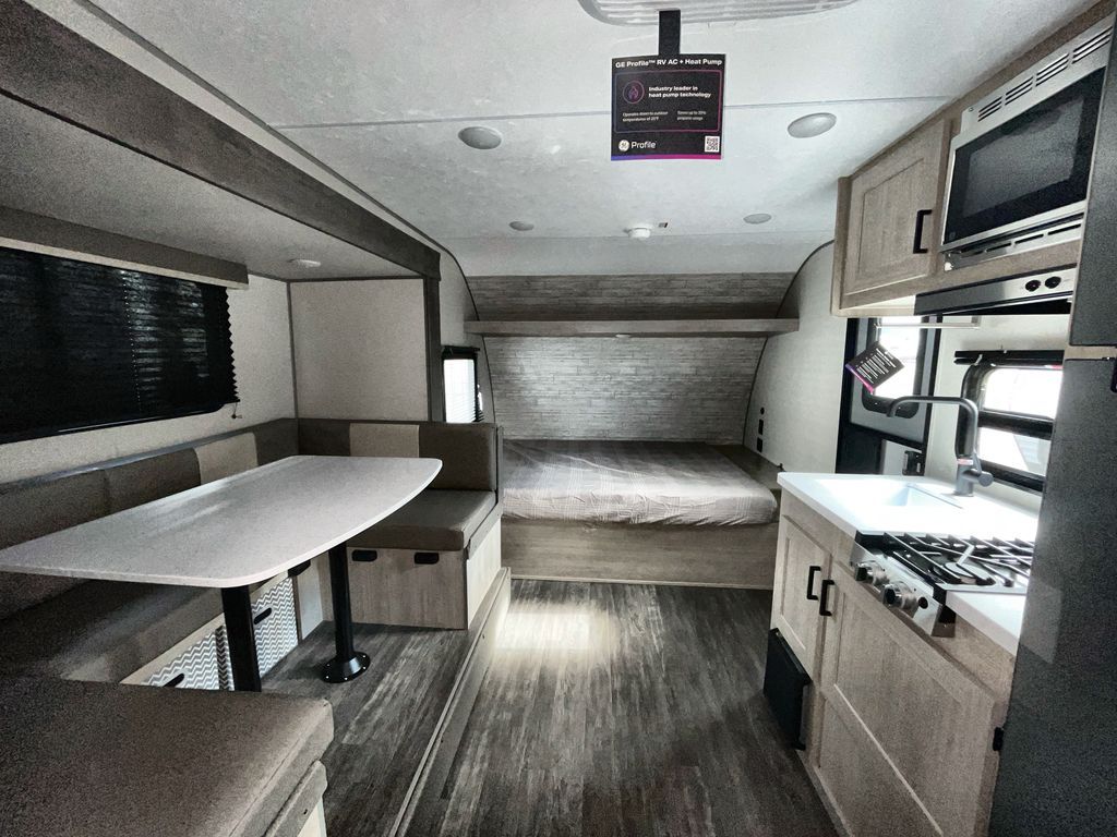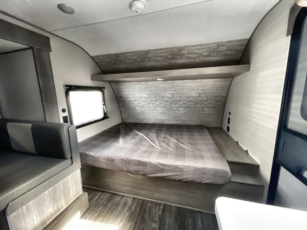 This travel trailer is ideal for anyone seeking a comfortable, stress-free getaway. Gather around the U-shaped dinette for meals, games, or movie nights – it's the perfect spot to make memories with loved ones. You can unwind in the full bathroom, complete with a tub/shower combo, or catch some Z's on the double-size bunk beds, perfect for kids or guests. The kitchen is equipped with a refrigerator, microwave, and sink, making it easy to whip up meals on the go. Overhead cabinets provide ample storage for your culinary needs. Finally, drift off to sleep under the stars, feeling refreshed and rejuvenated in the comfy queen bed surrounded by storage galore for your belongings.