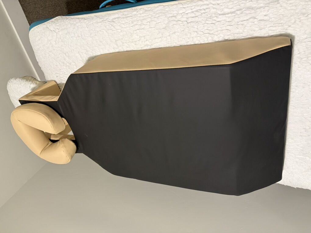 Previously used for prenatal massage. Pregnant women love it because it allows them to lay on their stomach. The tummy and breast areas are microfiber, soft and durable. Can also be used for somebody overweight and/or large breasted. Used a handful of times. Originally spent $140.